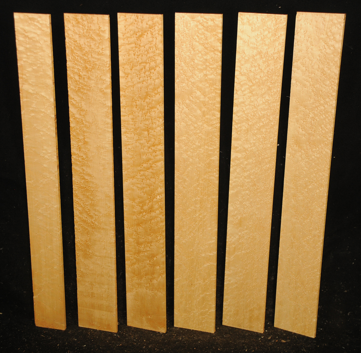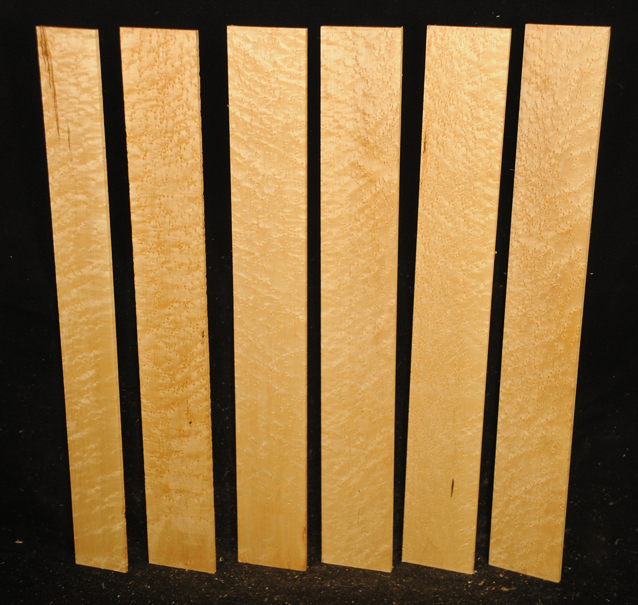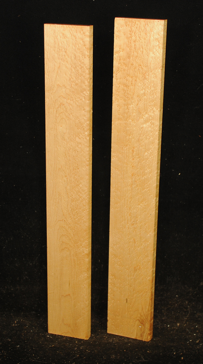 This European Maple is native to central Europe and west Asia. It is a tough, white or cream colored, fine-grained timber. It reminds me of vanilla ice cream because it is so even-colored. It works well in any grain direction. It is used for musical instruments, furniture, cabinetry, and because it is non-staining it is used for kitchen utensils, wooden spoons, rolling pins, and cutting boards. The figure is fiddleback on the quartersawn surface and more of a broken curl on the flatsawn surface. Select, quartersawn material is used for violin backs and sides and necks. Dry.