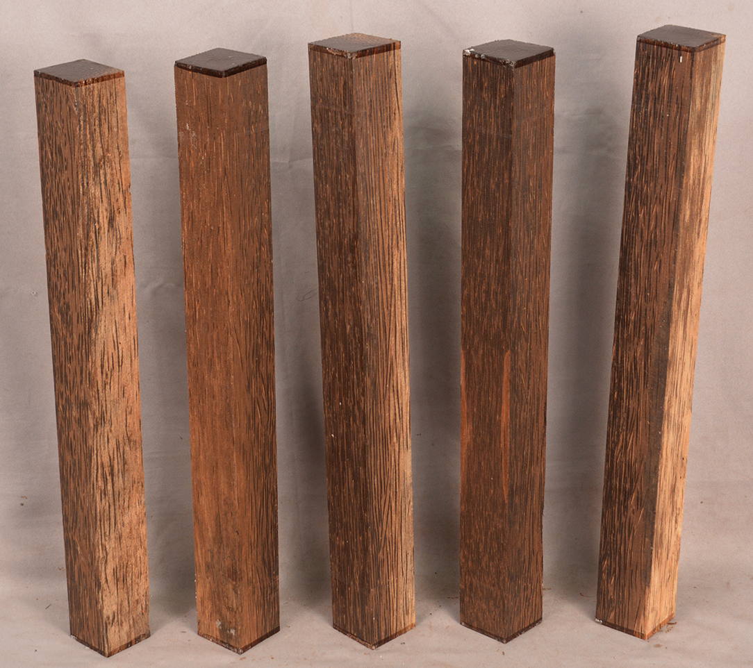 These are large palms, often up to 70 or 80 feet tall found in Asia, Central America and West Africa. When first felled they are often split into long beams and are used locally for canoes and drums. The wood, especially in older trees, is very hard and durable and consists of numerous fine, black fibers crowded densely together and surrounded by lighter colored, less dense material. The end grain gives the effect of lizard or snake skin. The densest wood is found on the outside of the trees and gets progressively softer towards the middle. Locally it is used for roof beams, bridges, and telephone poles, and is resistant to salt water, termites, and fungi. It takes a fine polish and is used for walking sticks, decorative handles, and boxes.