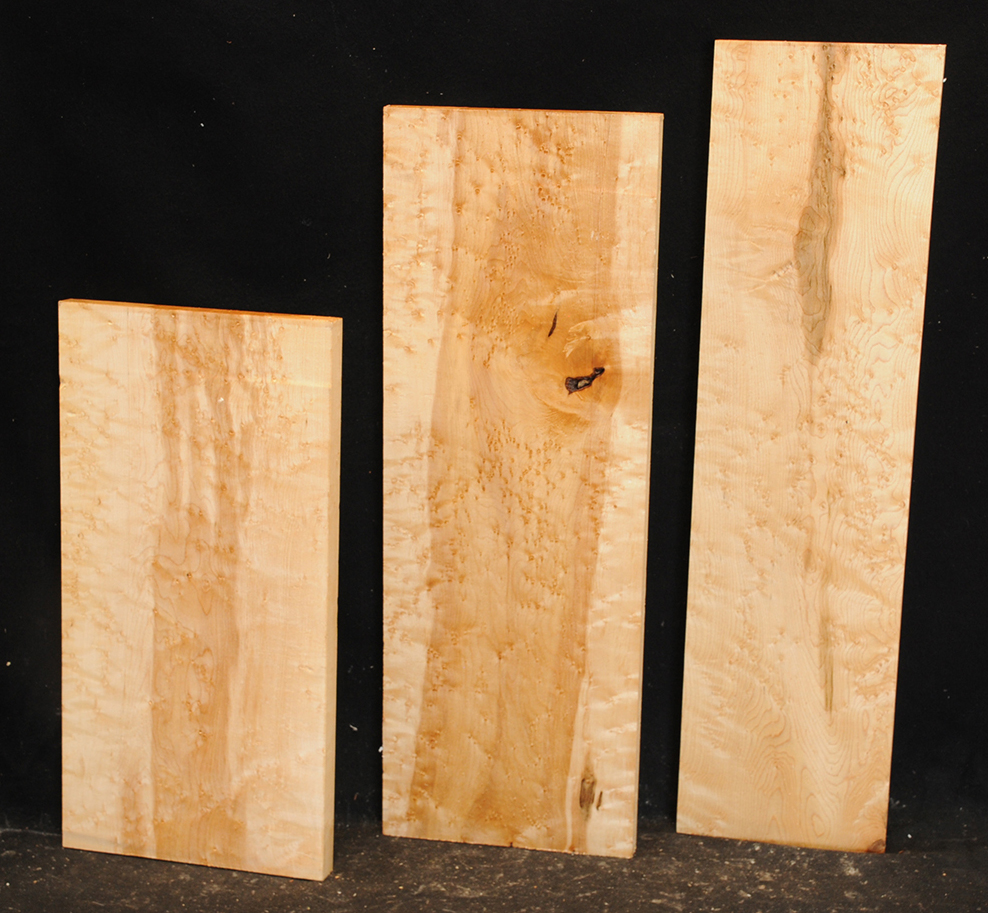 This European Maple is native to central Europe and west Asia. It is a tough, white or cream colored, fine-grained timber. It reminds me of vanilla ice cream because it is so even-colored. It works well in any grain direction. It is used for musical instruments, furniture, cabinetry, and because it is non-staining it is used for kitchen utensils, wooden spoons, rolling pins, and cutting boards. The figure is fiddleback on the quartersawn surface and more of a broken curl on the flatsawn surface. Select, quartersawn material is used for violin backs and sides and necks. Dry.