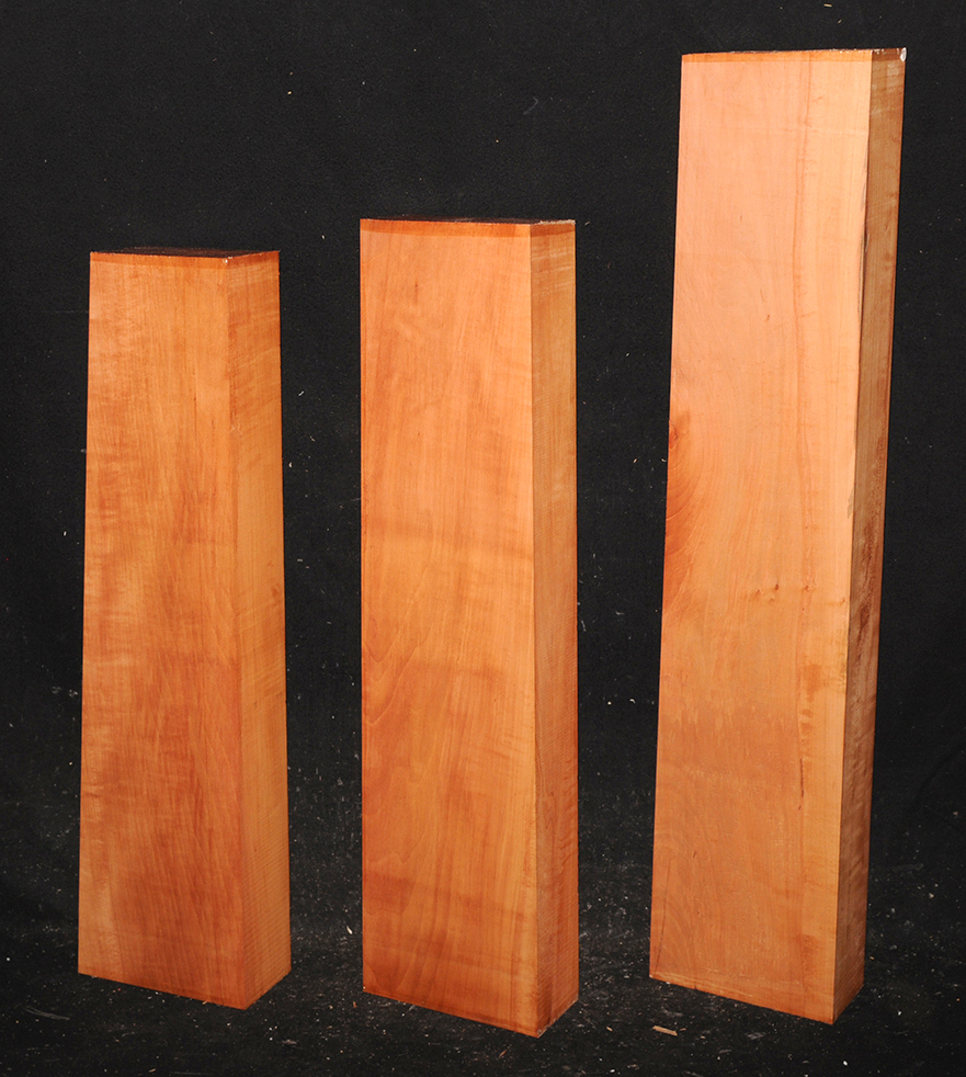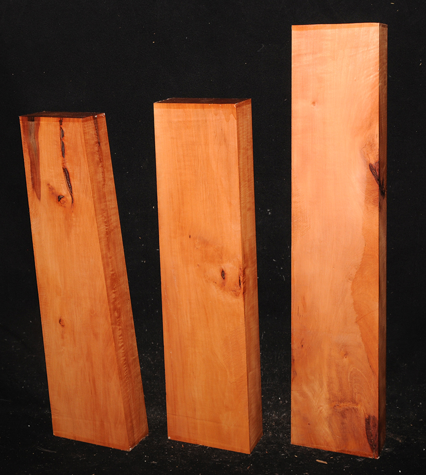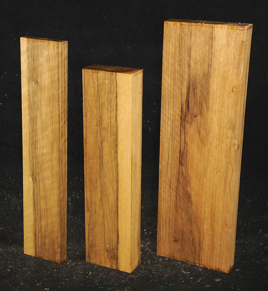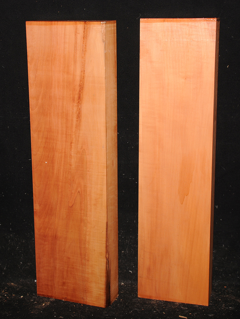The heartwood is white or cream to light brown or reddish brown. Because of the generally small size of available logs, most sawmills produce flatsawn boards which will show a broken curl on the surface and a fiddleback curl on the quartersawn edge. Hard and heavy, 45 lbs/cu ft. Easy to work and takes a smooth polish. U.S.A.