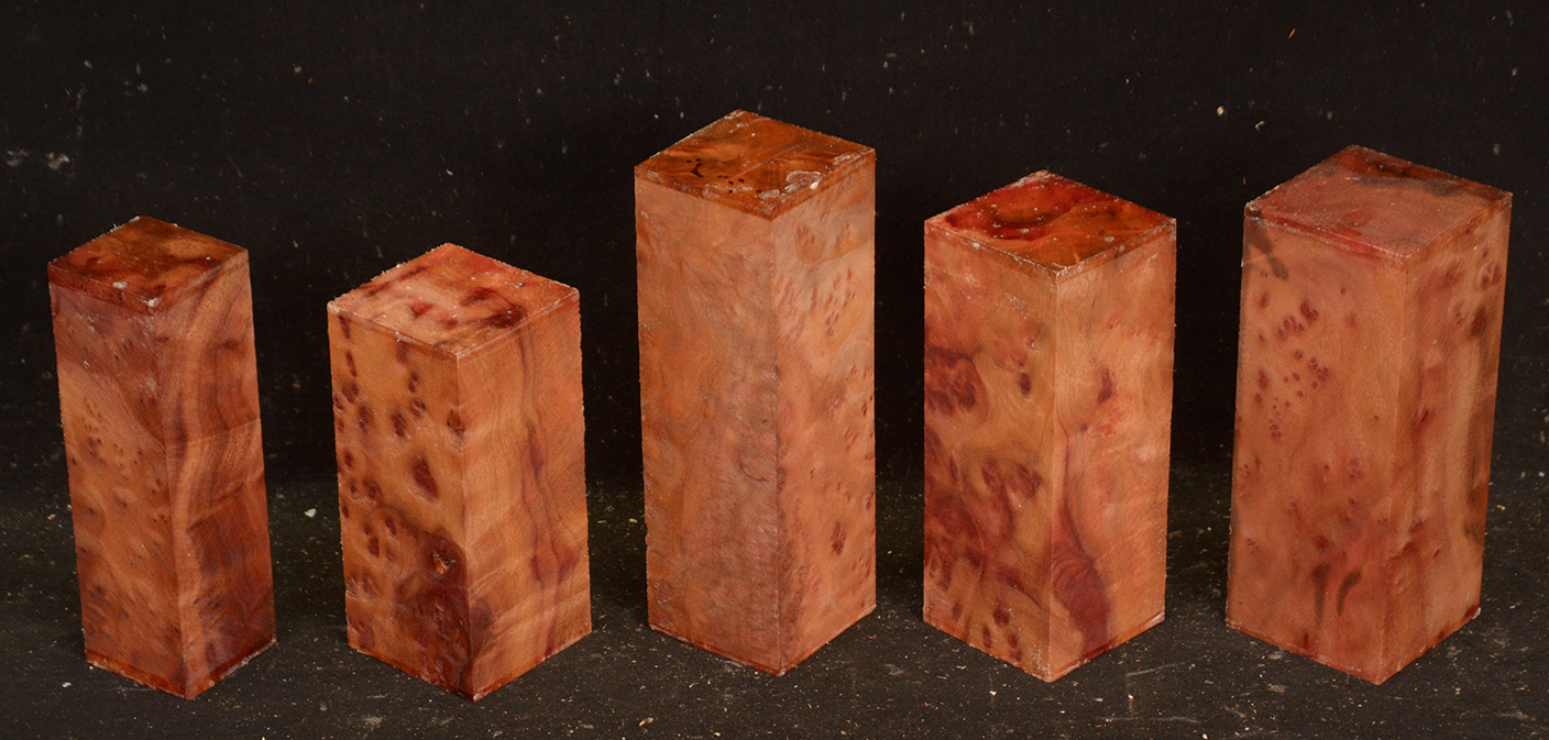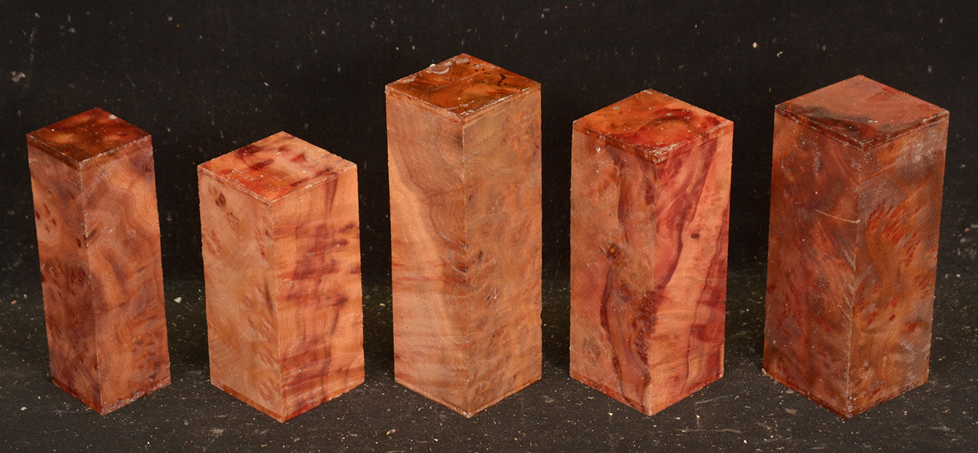 This rare burl is from S.E. Asia and is seldom seen on the world market. It is fine-grained and varies in color from a light reddish-brown to almost scarlet. It is easy to work and has a very pungent, spicy scent. For a burl it is remarkably stable. Green to partially air dried.