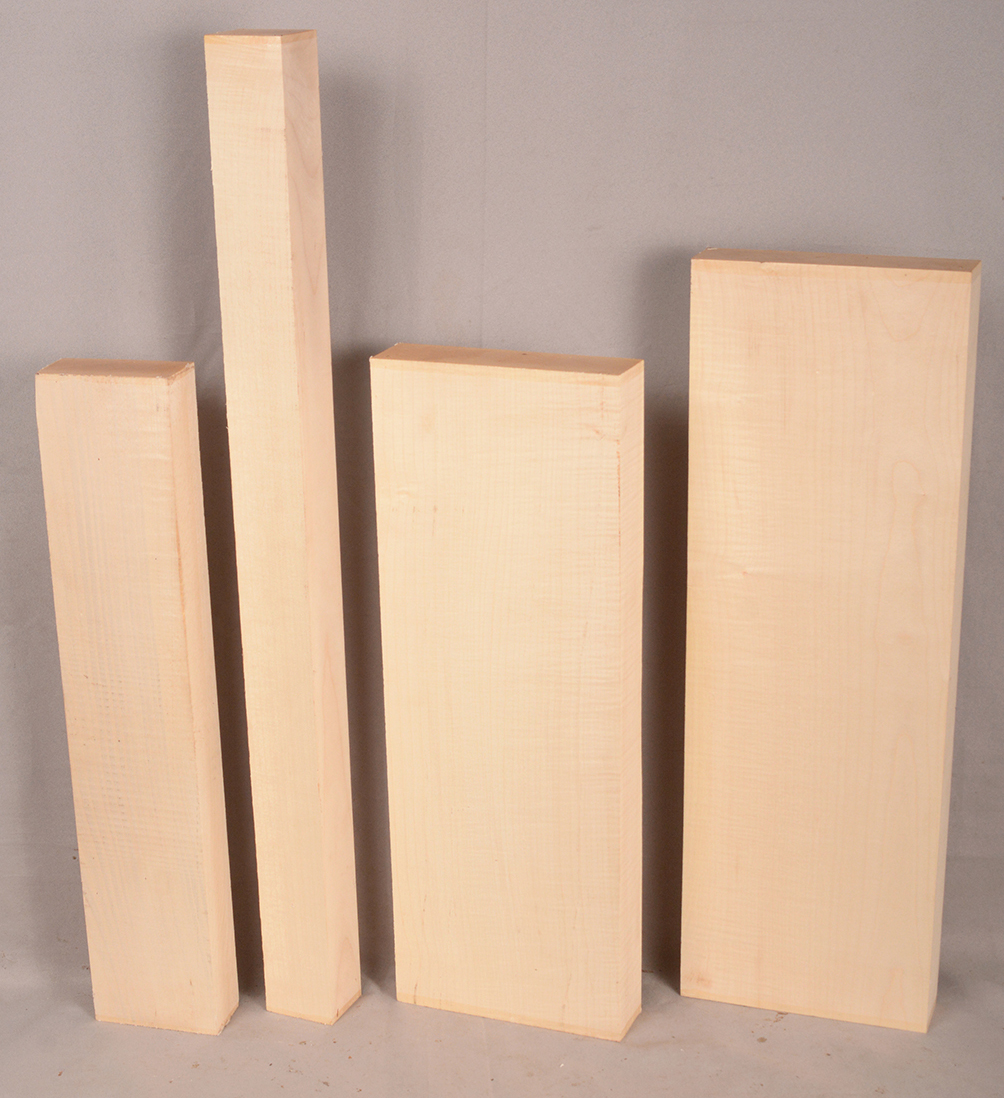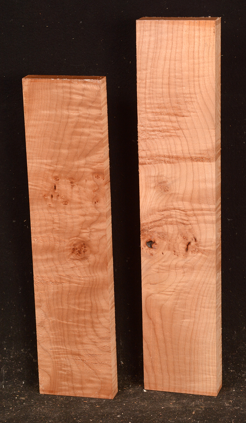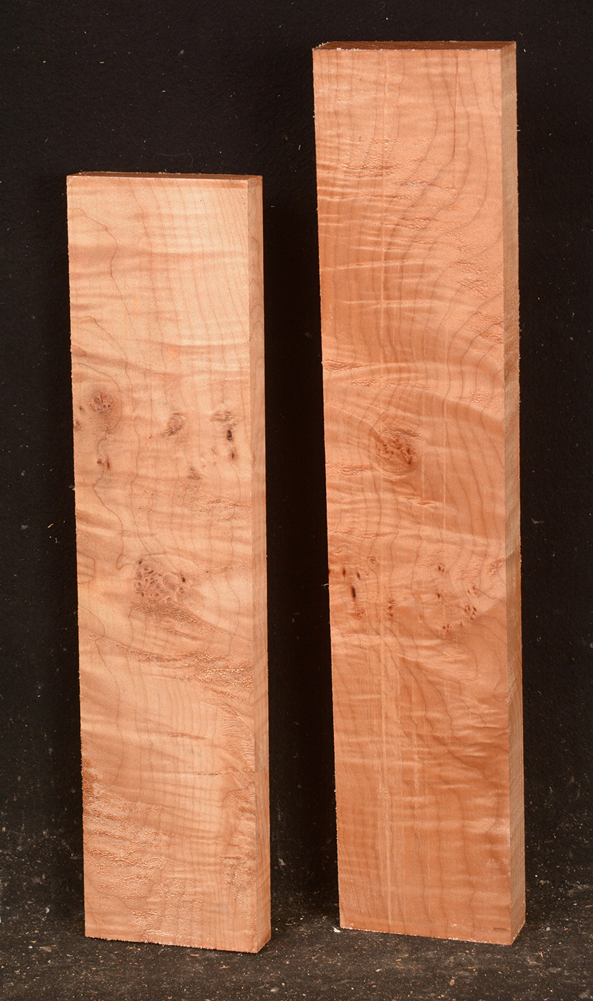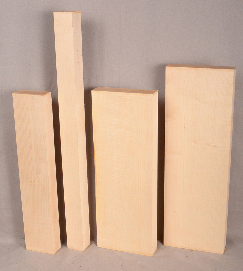 This European Maple is native to central Europe and west Asia. It is a tough, white or cream colored, fine-grained timber. It reminds me of vanilla ice cream because it is so even-colored. It works well in any grain direction. It is used for musical instruments, furniture, cabinetry, and because it is non-staining it is used for kitchen utensils, wooden spoons, rolling pins, and cutting boards. The figure is fiddleback on the quartersawn surface and more of a broken curl on the flatsawn surface. Select, quartersawn material is used for violin backs and sides and necks. Dry.