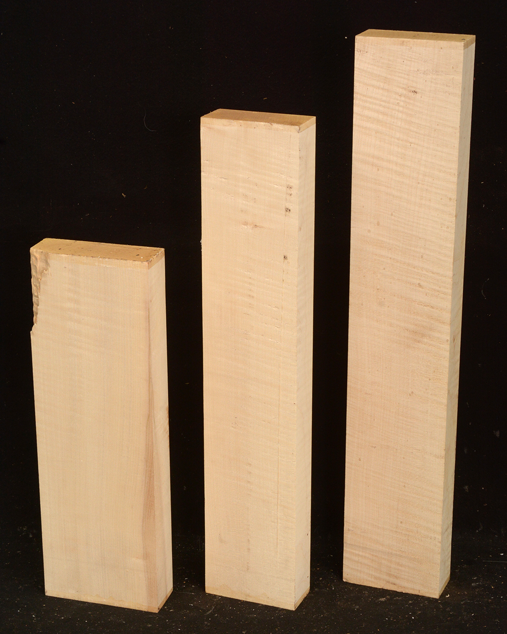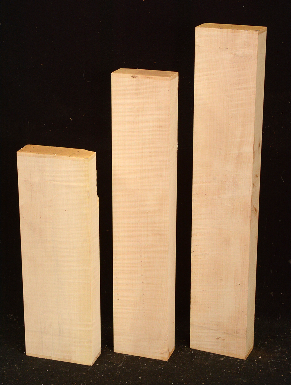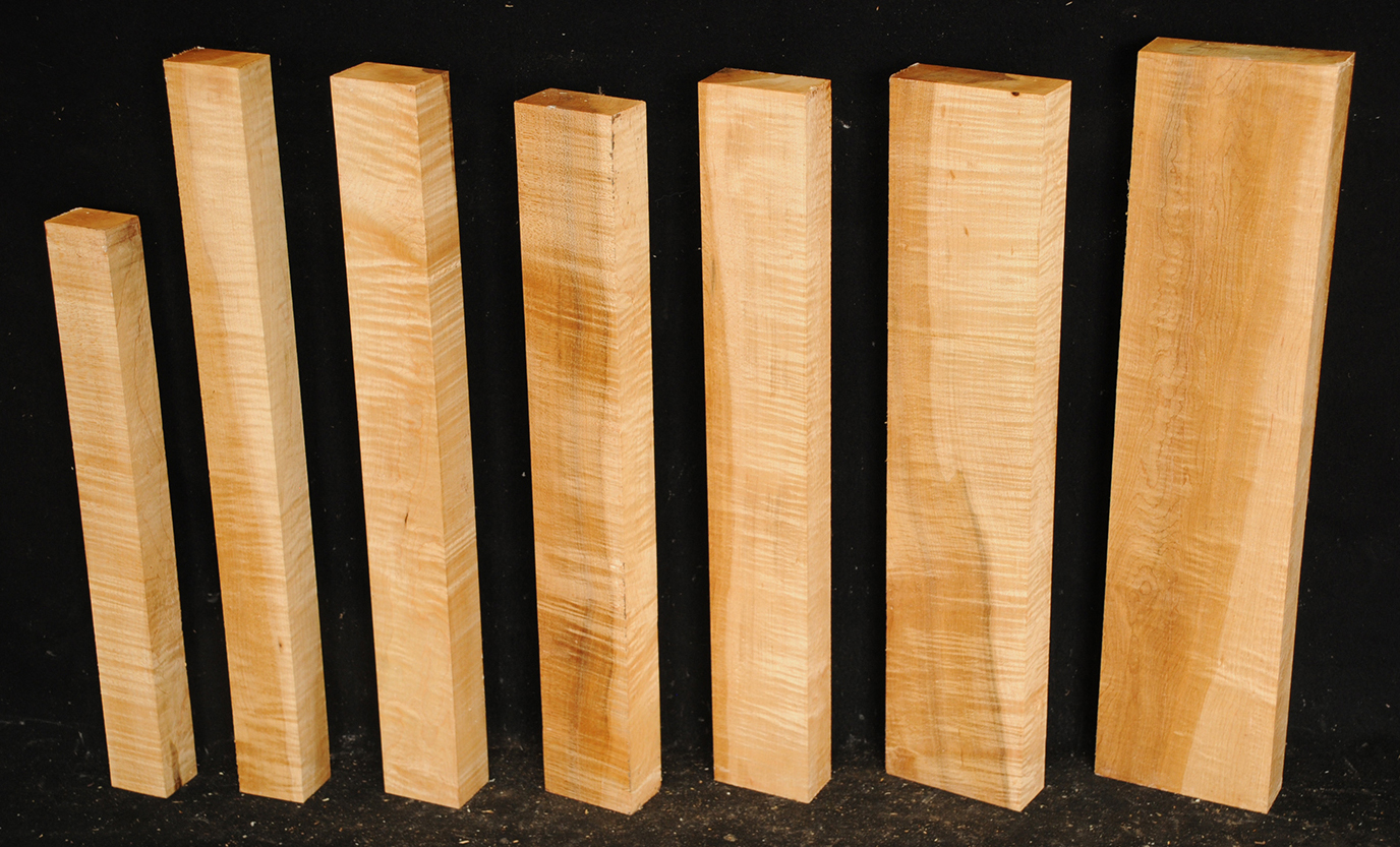 This European Maple is native to central Europe and west Asia. It is a tough, white or cream colored, fine-grained timber. It reminds me of vanilla ice cream because it is so even-colored. It works well in any grain direction. It is used for musical instruments, furniture, cabinetry, and because it is non-staining it is used for kitchen utensils, wooden spoons, rolling pins, and cutting boards. The figure is fiddleback on the quartersawn surface and more of a broken curl on the flatsawn surface. Select, quartersawn material is used for violin backs and sides and necks. Dry.