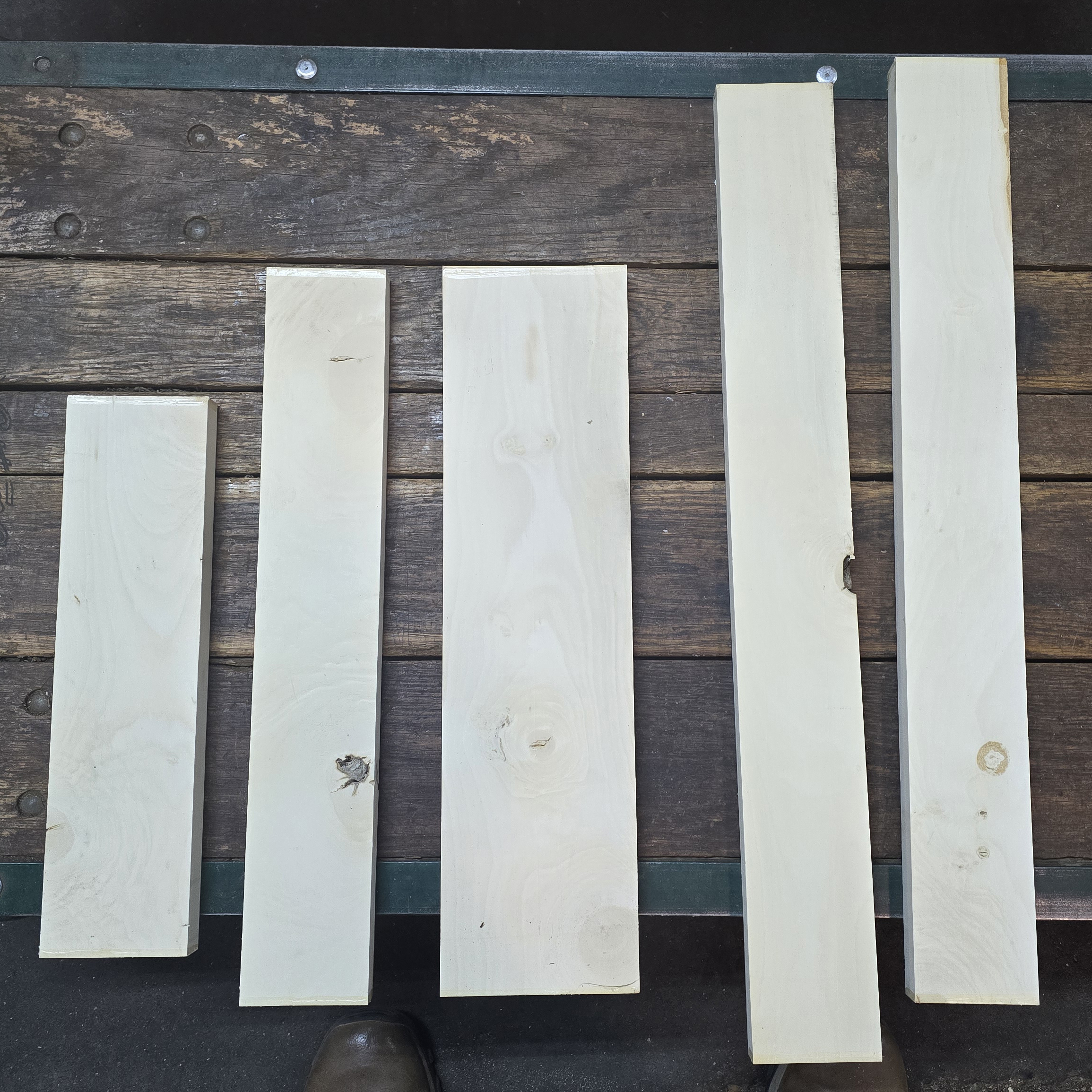 These we cut from logs so they have some minor defects, for example some checks or gum ducts. Quite nice still for this species. These pieces are quite green, but that color difficult to caputer in photographs.