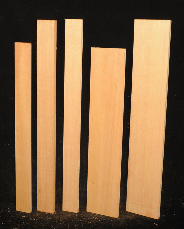 This European Maple is native to central Europe and west Asia. It is a tough, white or cream colored, fine-grained timber. It reminds me of vanilla ice cream because it is so even-colored. It works well in any grain direction. It is used for musical instruments, furniture, cabinetry, and because it is non-staining it is used for kitchen utensils, wooden spoons, rolling pins, and cutting boards. The figure is fiddleback on the quartersawn surface and more of a broken curl on the flatsawn surface. Select, quartersawn material is used for violin backs and sides and necks. Dry.