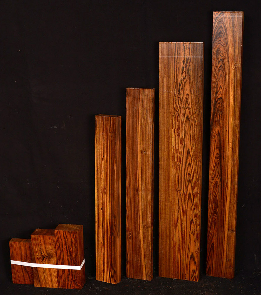 Also called Letterwood and Leopardwood. Color: dark red to reddish brown with irregular black speckles or stripes. Fine textured and highly lustrous. Very hard and heavy, 75-84 lbs/cu ft. Takes a beautiful finish. Very rare and very expensive. Guyana and Surinam.