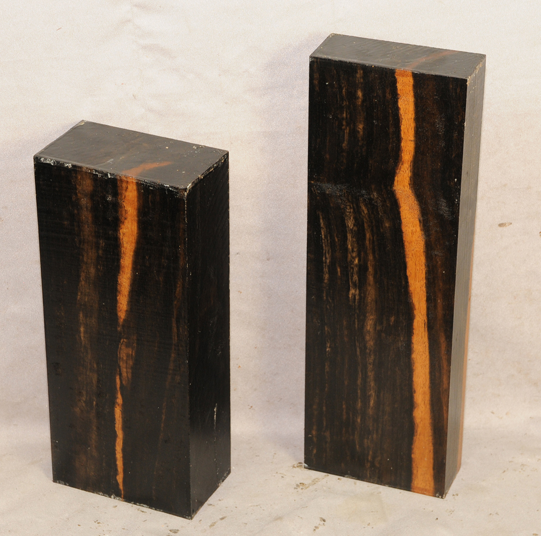 Sometimes called Gabon or Gaboon, this Ebony is sometimes jet black but oftentimes has grayish streaks that mostly disappear when finished or after the made object has been put into service. This Ebony has a marked resistance to checking that is characteristic of some of the Indian and Asian species. It has a wonderful texture and is easily carved, planed, turned, and milled. It is fairly fine-grained and takes a high polish. This Ebony usually originates in either Cameroon or Nigeria and the logs are rough hewn in the forest and oftentimes brought to the nearest road by human porters. With the disappearance of other species of black Ebony this species is fast becoming the Ebony of choice.