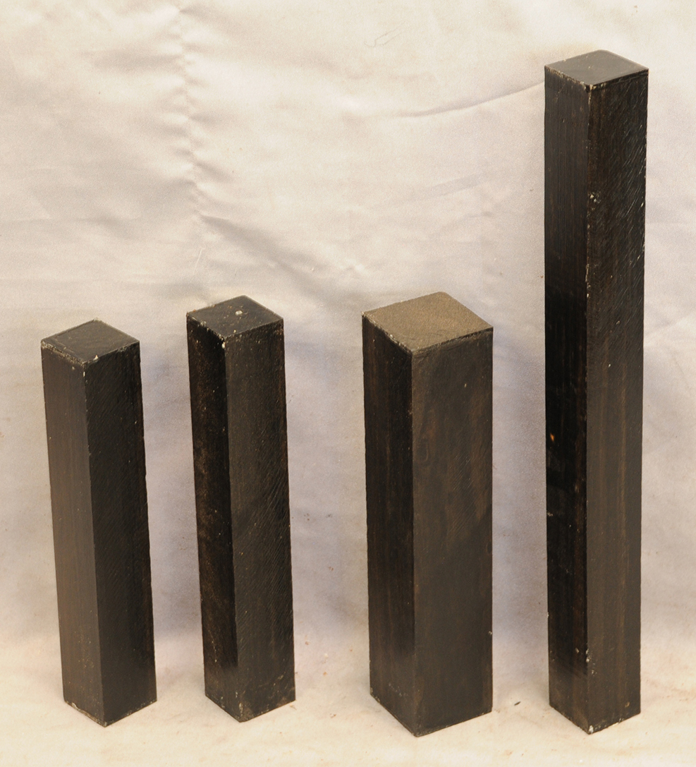 Sometimes called Gabon or Gaboon, this Ebony is sometimes jet black but oftentimes has grayish streaks that mostly disappear when finished or after the made object has been put into service. This Ebony has a marked resistance to checking that is characteristic of some of the Indian and Asian species. It has a wonderful texture and is easily carved, planed, turned, and milled. It is fairly fine-grained and takes a high polish. This Ebony usually originates in either Cameroon or Nigeria and the logs are rough hewn in the forest and oftentimes brought to the nearest road by human porters. With the disappearance of other species of black Ebony this species is fast becoming the Ebony of choice.