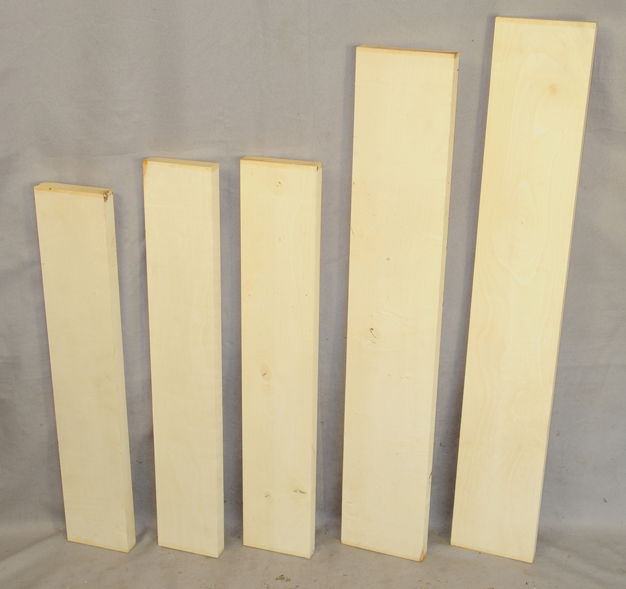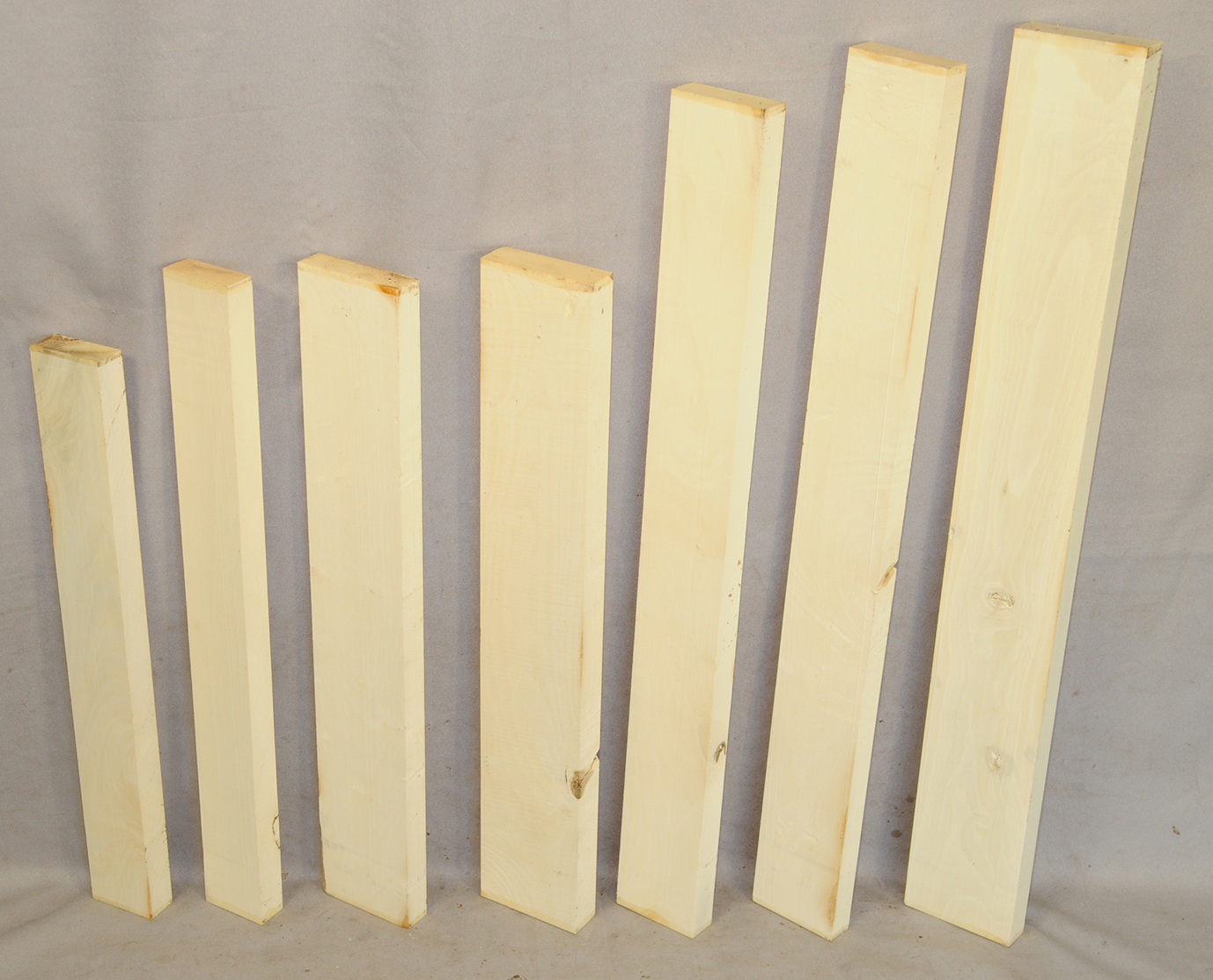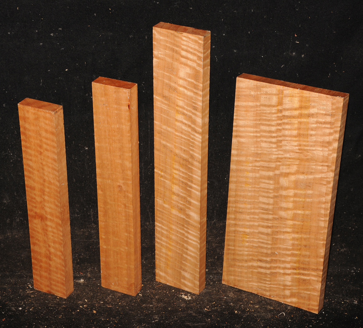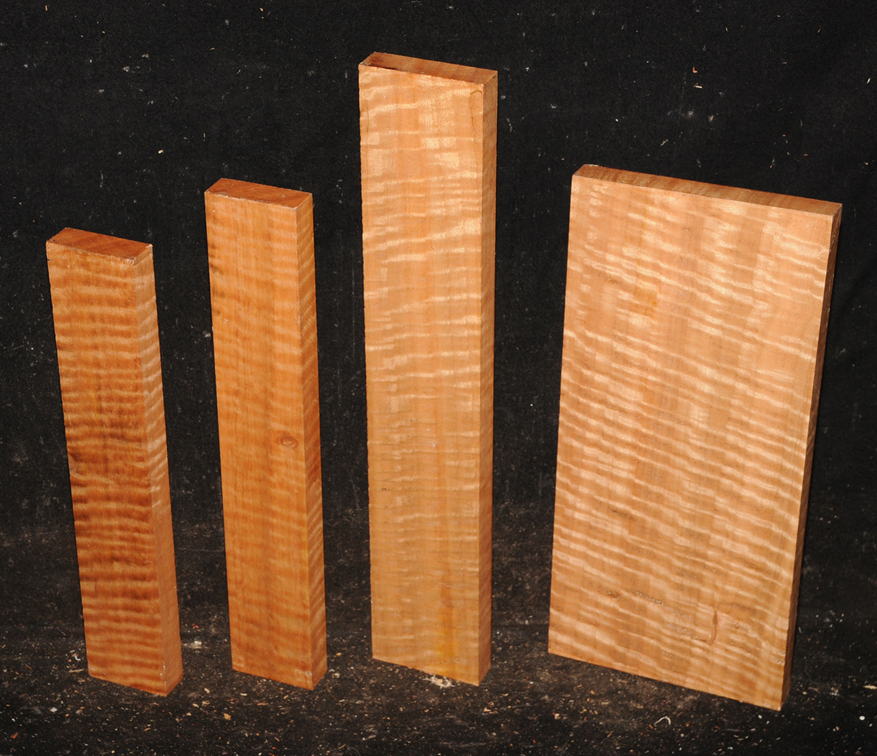 This European Maple is native to central Europe and west Asia. It is a tough, white or cream colored, fine-grained timber. It reminds me of vanilla ice cream because it is so even-colored. It works well in any grain direction. It is used for musical instruments, furniture, cabinetry, and because it is non-staining it is used for kitchen utensils, wooden spoons, rolling pins, and cutting boards. The figure is fiddleback on the quartersawn surface and more of a broken curl on the flatsawn surface. Select, quartersawn material is used for violin backs and sides and necks. Dry.
