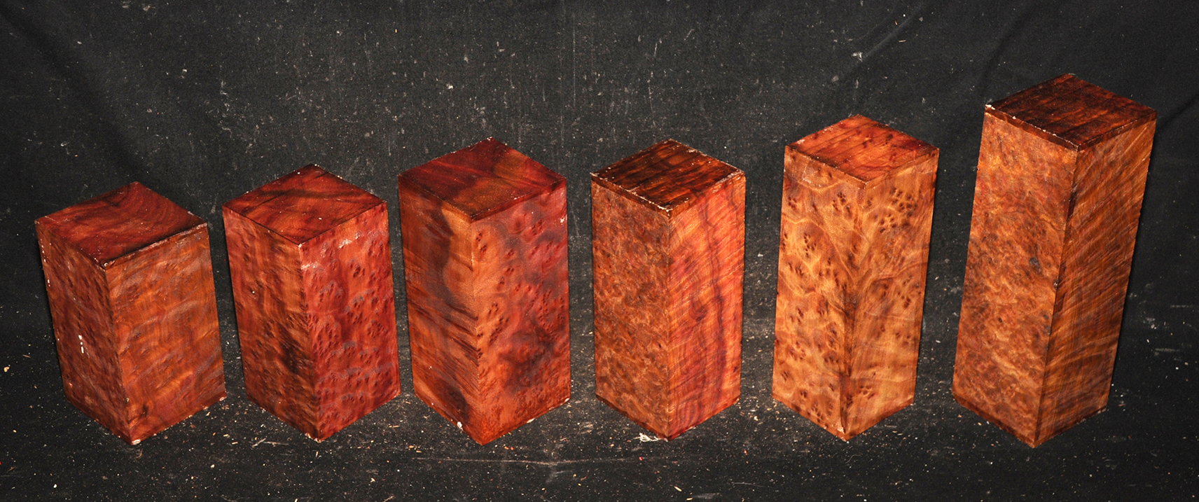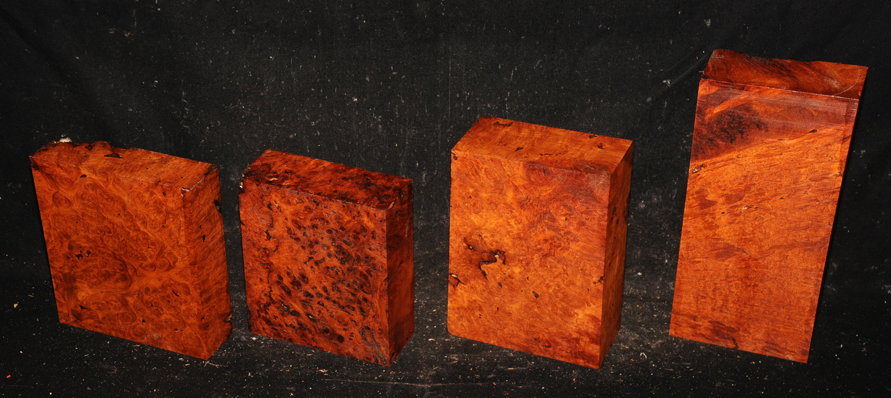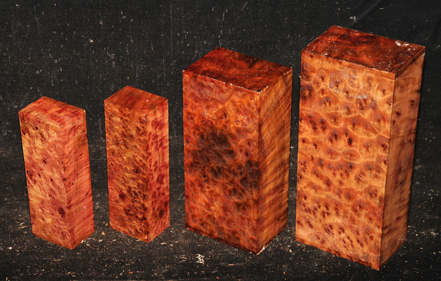 This rare burl is from S.E. Asia and is seldom seen on the world market. It is fine-grained and varies in color from a light reddish-brown to almost scarlet. It is easy to work and has a very pungent, spicy scent. For a burl it is remarkably stable. Green to partially air dried.