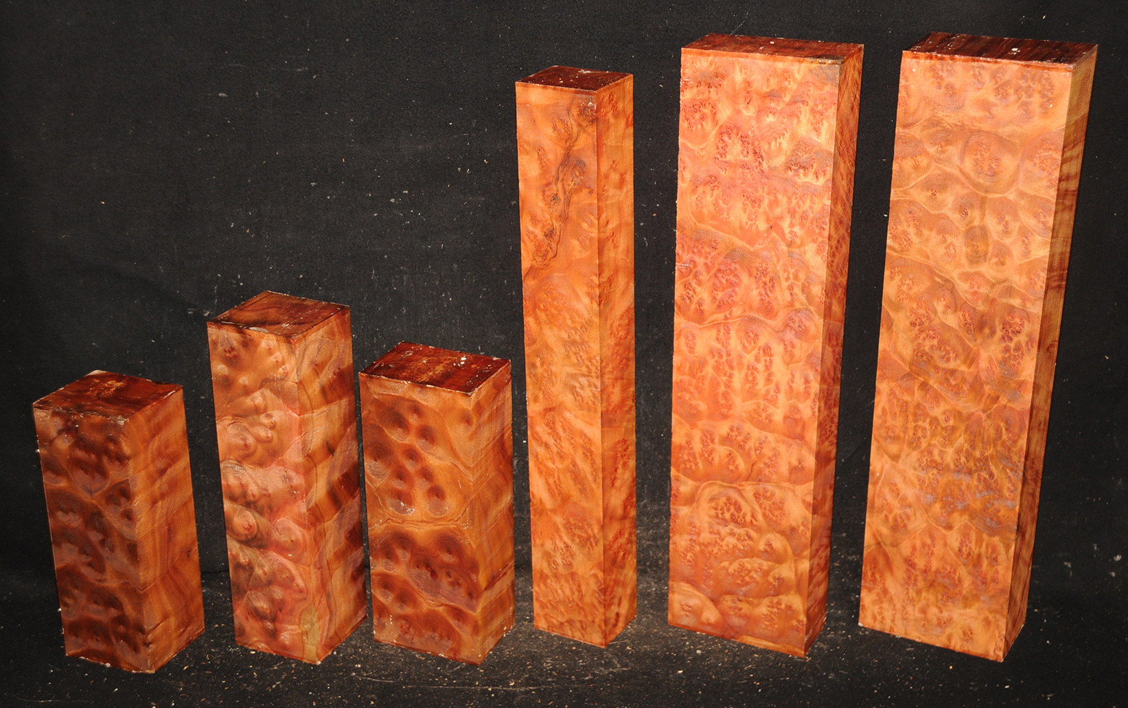This rare burl is from S.E. Asia and is seldom seen on the world market. It is fine-grained and varies in color from a light reddish-brown to almost scarlet. It is easy to work and has a very pungent, spicy scent. For a burl it is remarkably stable. Green to partially air dried.