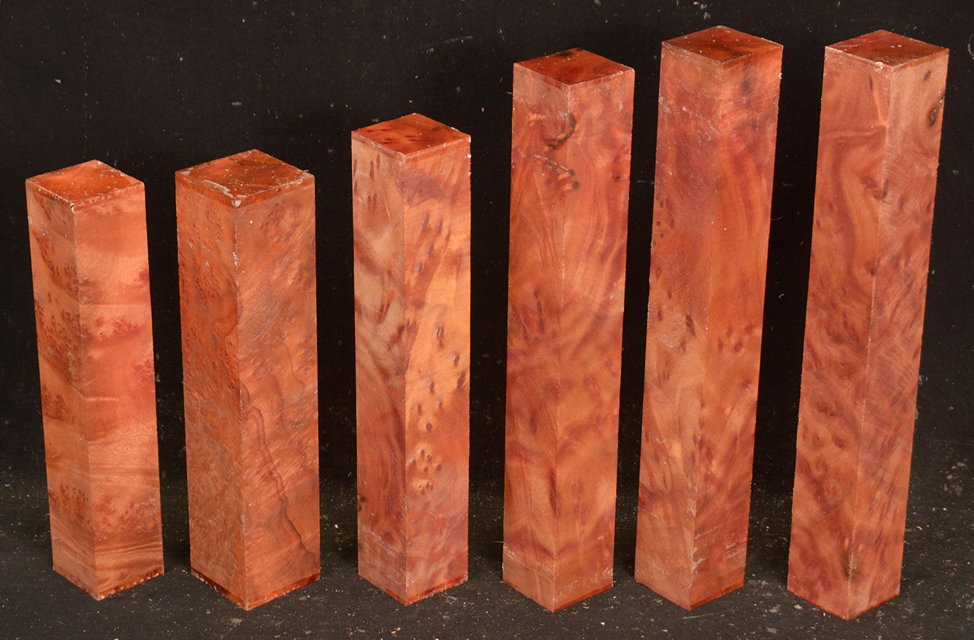 This rare burl is from S.E. Asia and is seldom seen on the world market. It is fine-grained and varies in color from a light reddish-brown to almost scarlet. It is easy to work and has a very pungent, spicy scent. For a burl it is remarkably stable. Green to partially air dried.