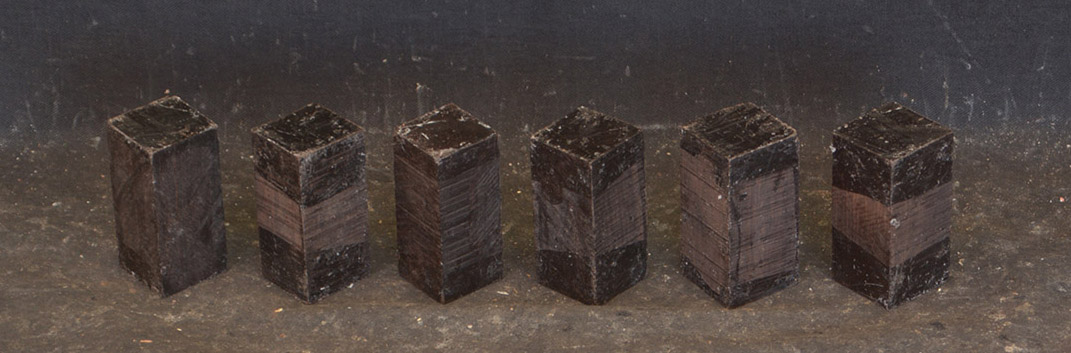 The heartwood is purplish to brownish-black with dark gray streaks giving an overall impression of being black. Lustrous with an attractive inner chatoyance. Very hard, heavy, close-grained, and virtually free from pores. Slightly oily to the touch. The sapwood is straw colored to a bright yellow and can be as wide as 2". African Blackwood can weigh as much as 85 lbs per cubic foot. It is used for marquetry, inlays, knife handles, game calls, pistol grips, pool cue butts, chess pieces, jewelry, and other precious arts and crafts. But its main use is in turning, and it claims the title of the finest of turnery woods, well known as the standard by which other turnery woods are judged. Long a favorite of ornamental turners, the nature of the wood allows very fine detail with sharp cutters, leaving a beautiful, burnished surface. Its stability, oily nature, resistance to moisture, and lovely finishing qualities make it superior to other timbers. These are best quality squares. Rare.