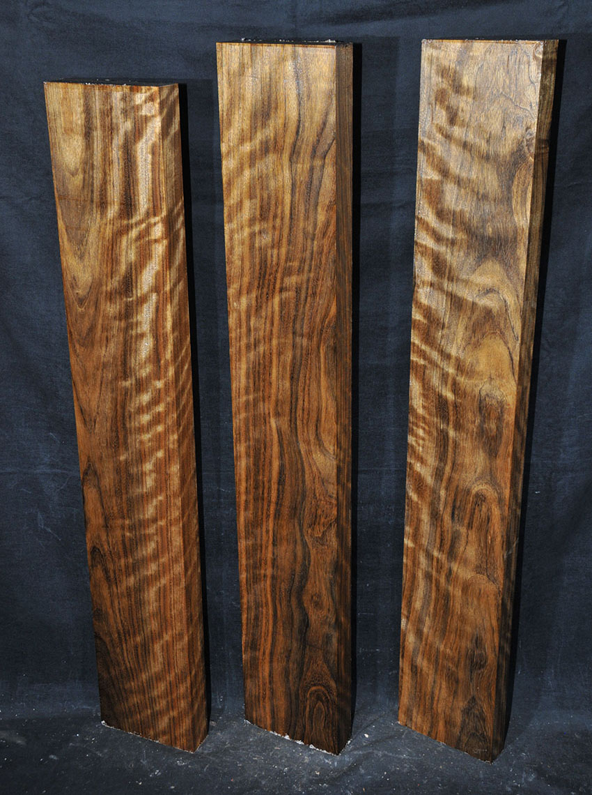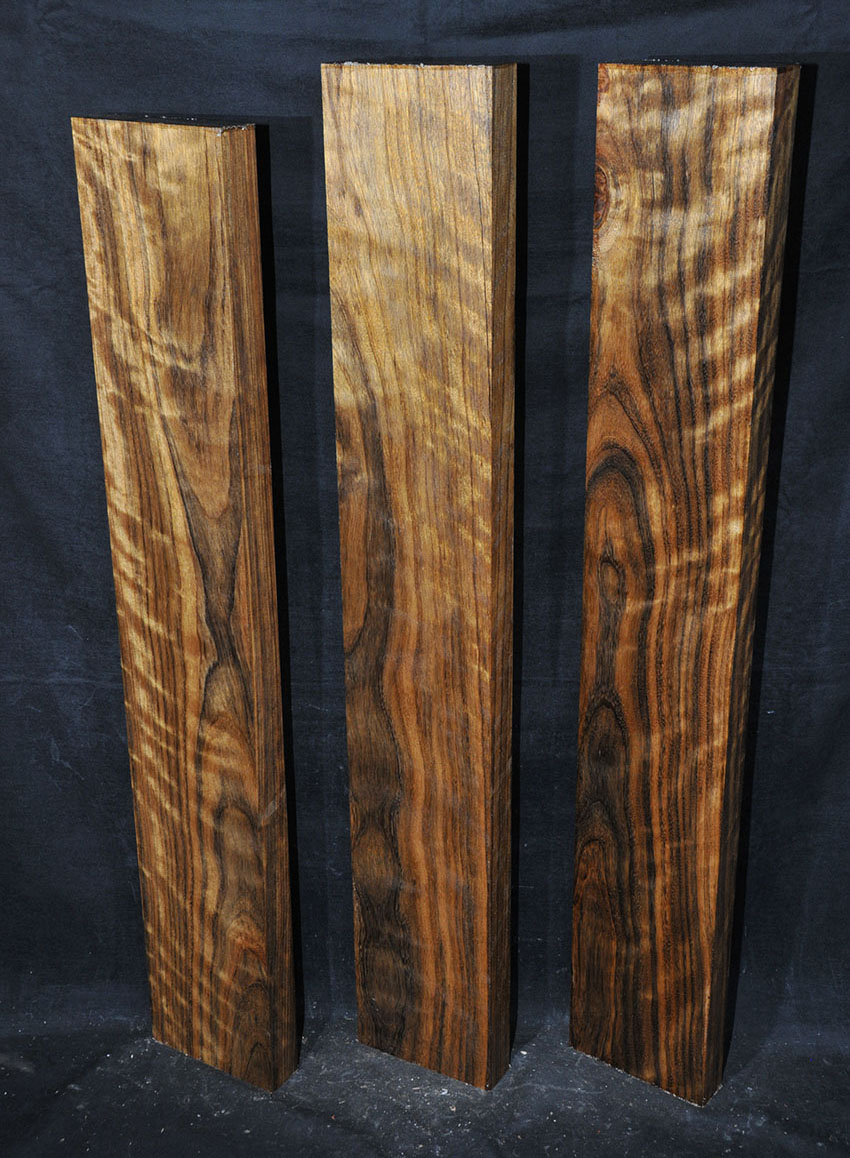 Also called Ovangkol and Amazakoue. This wood is increasingly becoming popular as an acoustic guitar wood. The color varies from a rich, golden brown to a lustrous grayish brown usually with a black stripe.