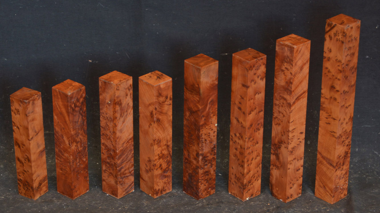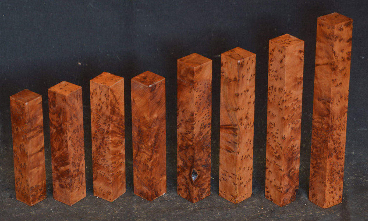 This comes from the Atlas mountains in Morocco and has a beautiful golden chatoyance. Its color varies from a rich, lustrous golden brown to nearly black. Thuya burl is hard and dense with a high oil content, but tends to be brittle. The eyes, perfectly round, are scattered about in some burls like the figure in bird's-eye maple; in others they are grouped as islands. Due to it's desert occurrence, the wood sometimes contains small defects or inclusions but most can be repaired with cyanoacrylate (super) glues. A rare species, this exquisite wood is used for inlays, small boxes, turnery, and precious objects.