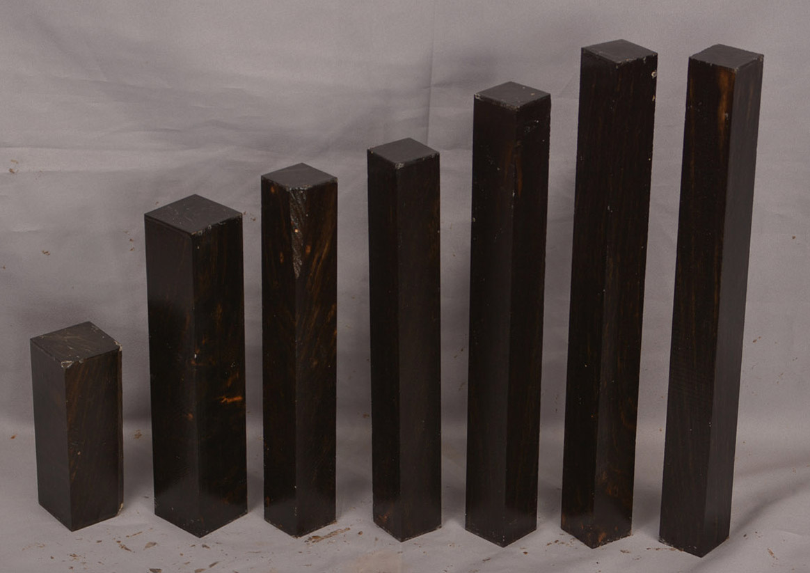 Sometimes called Gabon or Gaboon, this Ebony is sometimes jet black but oftentimes has grayish streaks that mostly disappear when finished or after the made object has been put into service. This Ebony has a marked resistance to checking that is characteristic of some of the Indian and Asian species. It has a wonderful texture and is easily carved, planed, turned, and milled. It is fairly fine-grained and takes a high polish. This Ebony usually originates in either Cameroon or Nigeria and the logs are rough hewn in the forest and oftentimes brought to the nearest road by human porters. With the disappearance of other species of black Ebony this species is fast becoming the Ebony of choice.