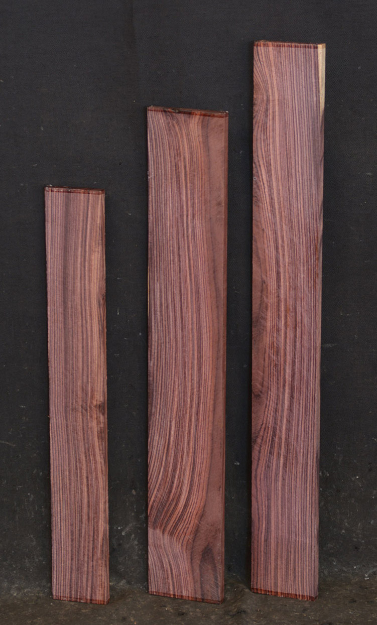 A true rosewood. The wood is variegated with different shades of purple and darker stripes. The specific gravity is 1.2 so it is hard and heavy. Used for inlays and bandings, turnery, and fancy furniture accessories.