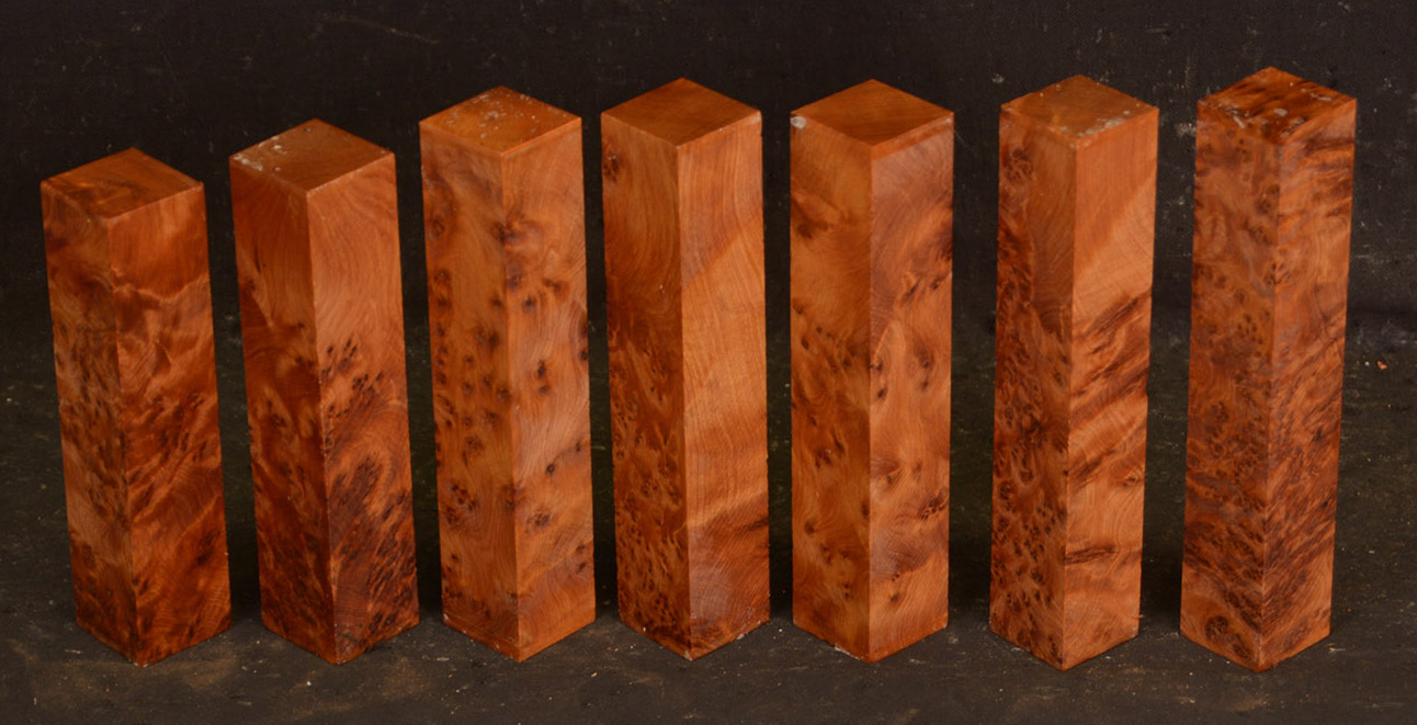 This comes from the Atlas mountains in Morocco and has a beautiful golden chatoyance. Its color varies from a rich, lustrous golden brown to nearly black. Thuya burl is hard and dense with a high oil content, but tends to be brittle. The eyes, perfectly round, are scattered about in some burls like the figure in bird's-eye maple; in others they are grouped as islands. Due to it's desert occurrence, the wood sometimes contains small defects or inclusions but most can be repaired with cyanoacrylate (super) glues. A rare species, this exquisite wood is used for inlays, small boxes, turnery, and precious objects.