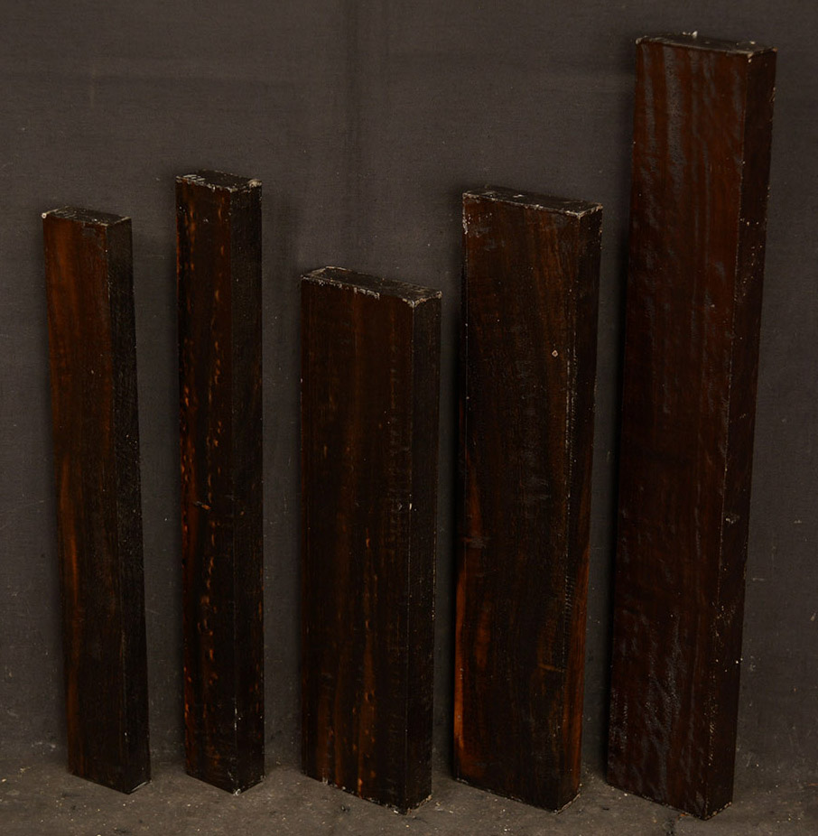 Sometimes called Gabon or Gaboon, this Ebony is sometimes jet black but oftentimes has grayish streaks that mostly disappear when finished or after the made object has been put into service. This Ebony has a marked resistance to checking that is characteristic of some of the Indian and Asian species. It has a wonderful texture and is easily carved, planed, turned, and milled. It is fairly fine-grained and takes a high polish. This Ebony usually originates in either Cameroon or Nigeria and the logs are rough hewn in the forest and oftentimes brought to the nearest road by human porters. With the disappearance of other species of black Ebony this species is fast becoming the Ebony of choice.