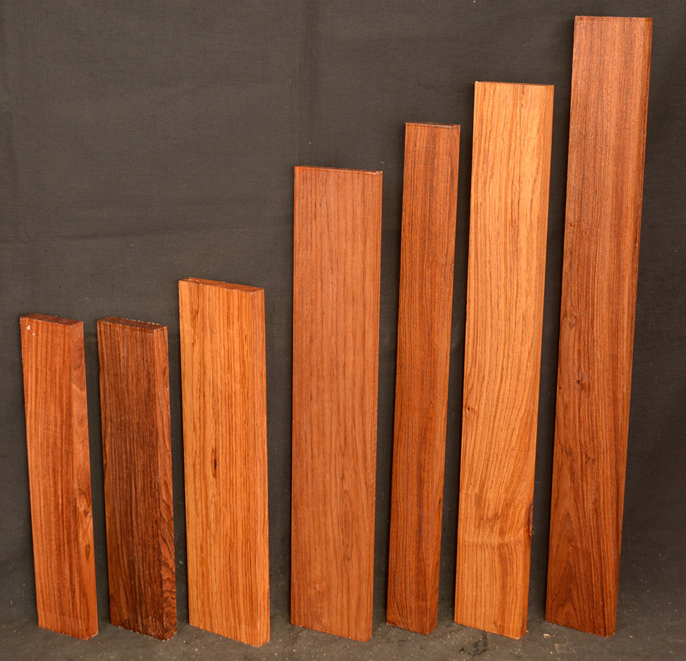 This Rosewood species has a reddish-brown to dark brown colored heartwood contrasting the almost white sapwood. The dust has a sweet odor. It is an excellent furniture/case works/jewelry box wood and even though it has a medium texture it does take a nice polish. We also offer it as a musical instrument wood (see guitar fingerboards and backs & sides elsewhere on the site). It has a very "crisp" tap tone with good sustain.