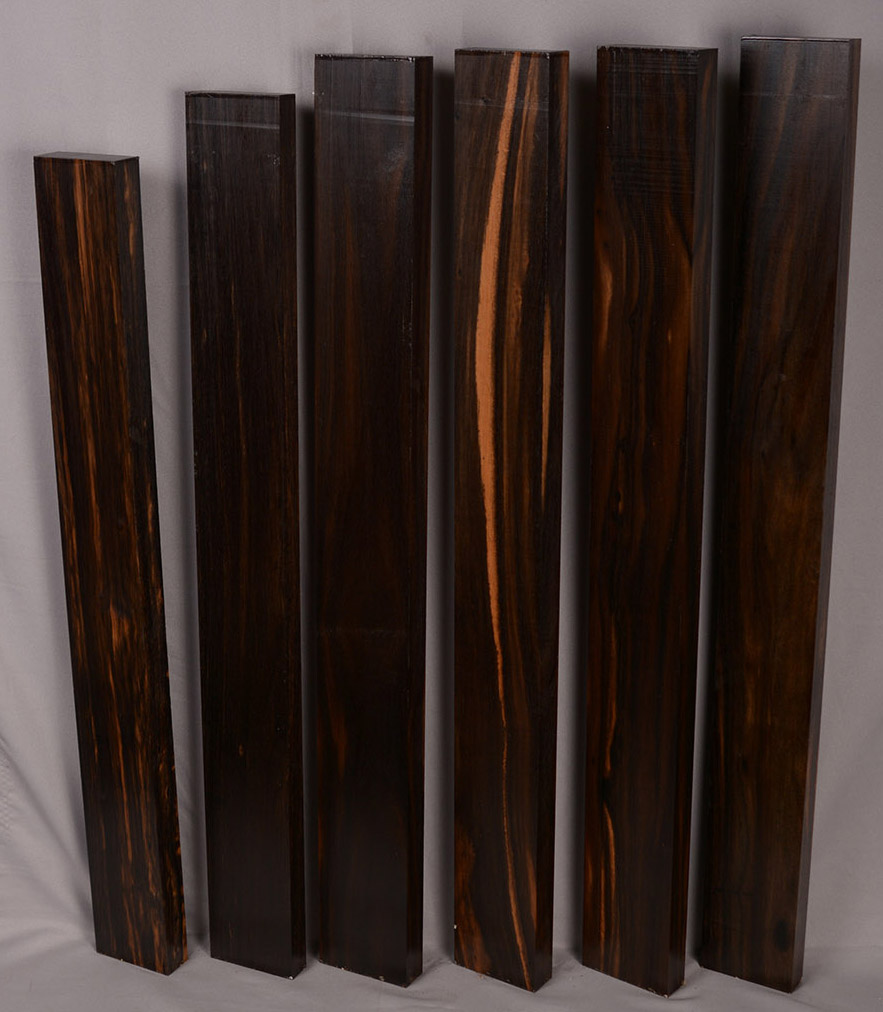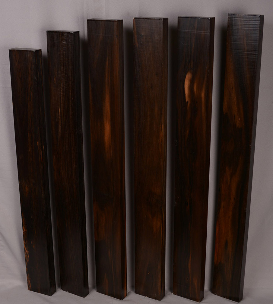 Sometimes called Gabon or Gaboon, this Ebony is sometimes jet black but oftentimes has grayish streaks that mostly disappear when finished or after the made object has been put into service. This Ebony has a marked resistance to checking that is characteristic of some of the Indian and Asian species. It has a wonderful texture and is easily carved, planed, turned, and milled. It is fairly fine-grained and takes a high polish. This Ebony usually originates in either Cameroon or Nigeria and the logs are rough hewn in the forest and oftentimes brought to the nearest road by human porters. With the disappearance of other species of black Ebony this species is fast becoming the Ebony of choice.