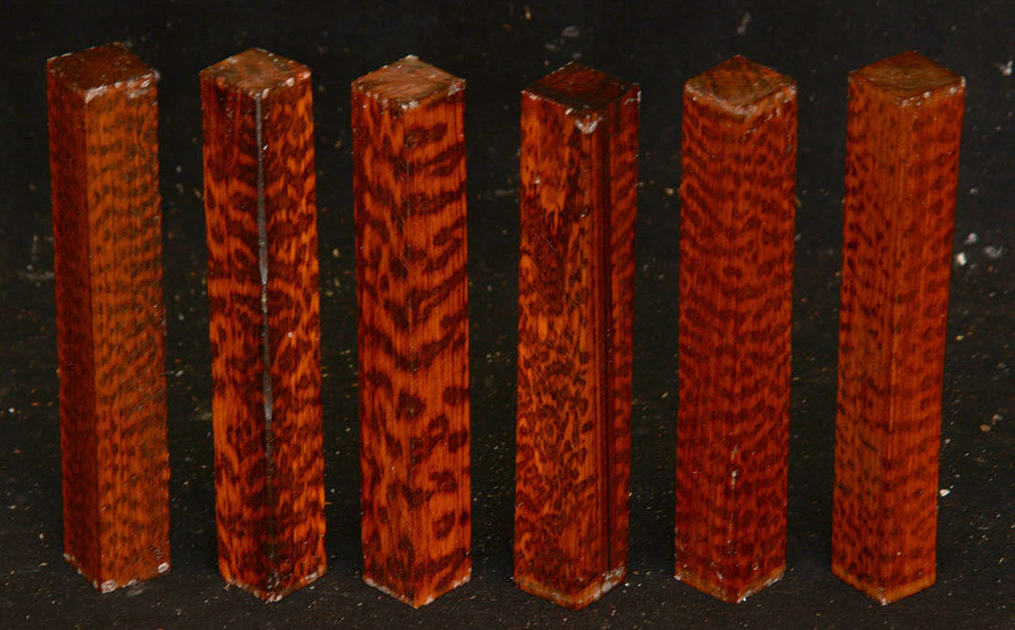 Also called Letterwood and Leopardwood. Color: dark red to reddish brown with irregular black speckles or stripes. Fine textured and highly lustrous. Very hard and heavy, 75-84 lbs/cu ft. Takes a beautiful finish. Very rare and very expensive. Guyana and Surinam.