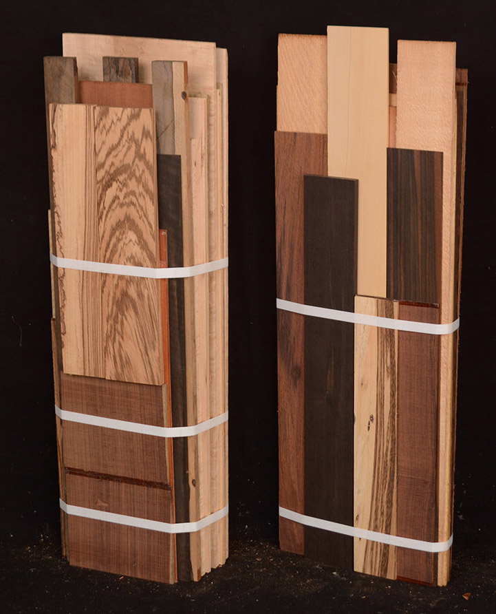 Bundle A contains a mix of species, including Bird's-eye Maple, Curly White Oak, Black Limba, Sitka Spruce, ZIricote, Myrtlewood, New Guinea Striped Ebony, Zebrawood, Red Chacate, and Amazon Rosewood. 26 pieces.