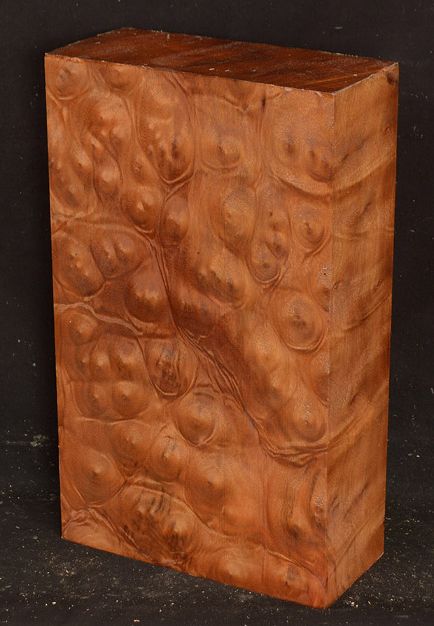 This rare burl is from S.E. Asia and is seldom seen on the world market. It is fine-grained and varies in color from a light reddish-brown to almost scarlet. It is easy to work and has a very pungent, spicy scent. For a burl it is remarkably stable. Green to partially air dried.