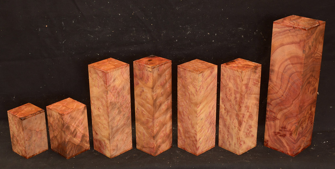This rare burl is from S.E. Asia and is seldom seen on the world market. It is fine-grained and varies in color from a light reddish-brown to almost scarlet. It is easy to work and has a very pungent, spicy scent. For a burl it is remarkably stable. Green to partially air dried.
