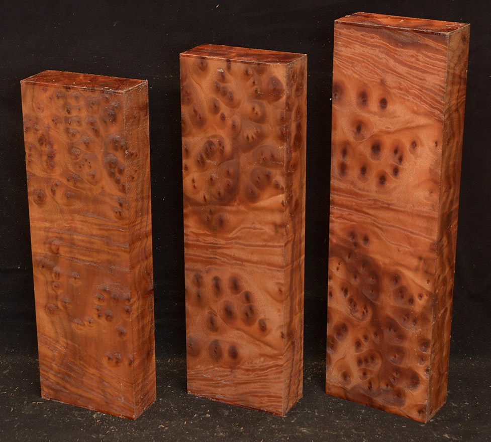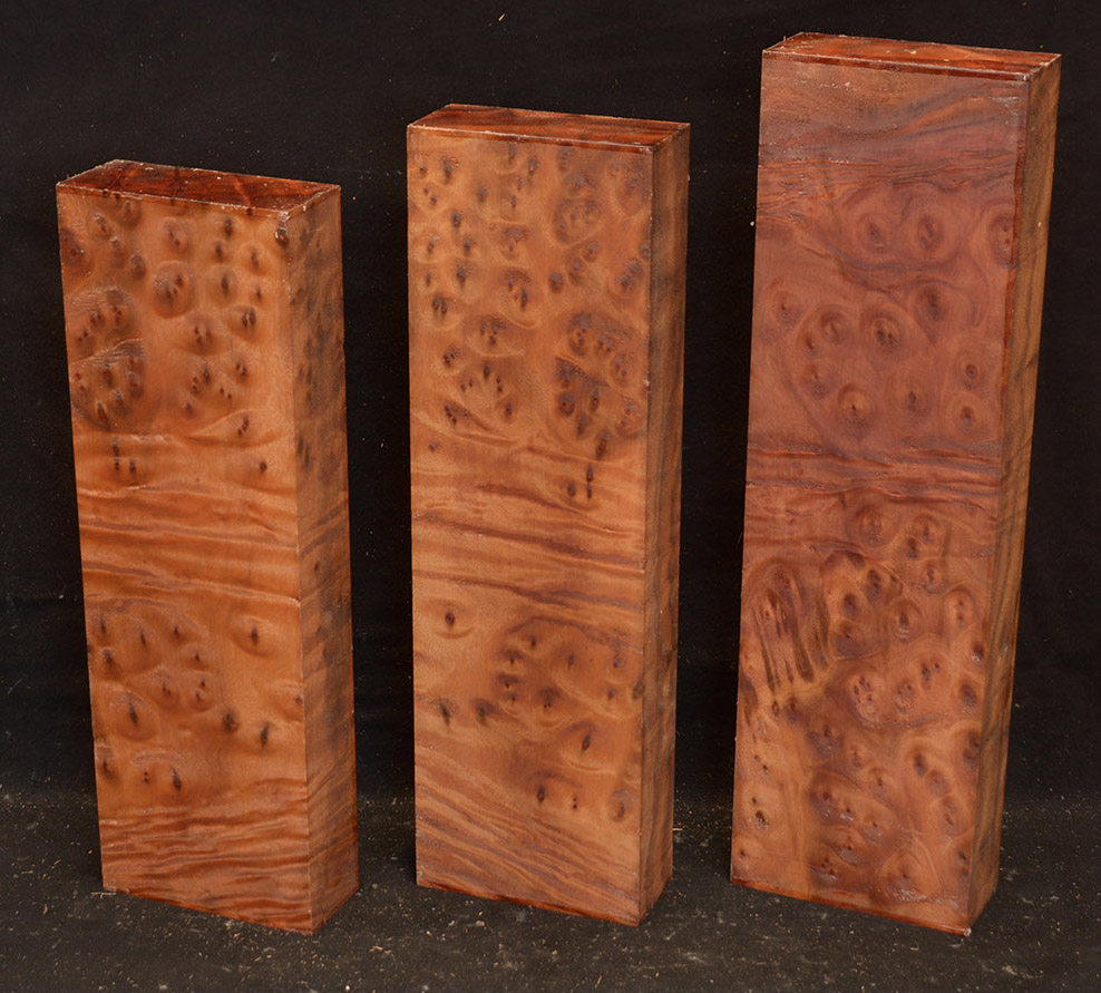This rare burl is from S.E. Asia and is seldom seen on the world market. It is fine-grained and varies in color from a light reddish-brown to almost scarlet. It is easy to work and has a very pungent, spicy scent. For a burl it is remarkably stable. Green to partially air dried.