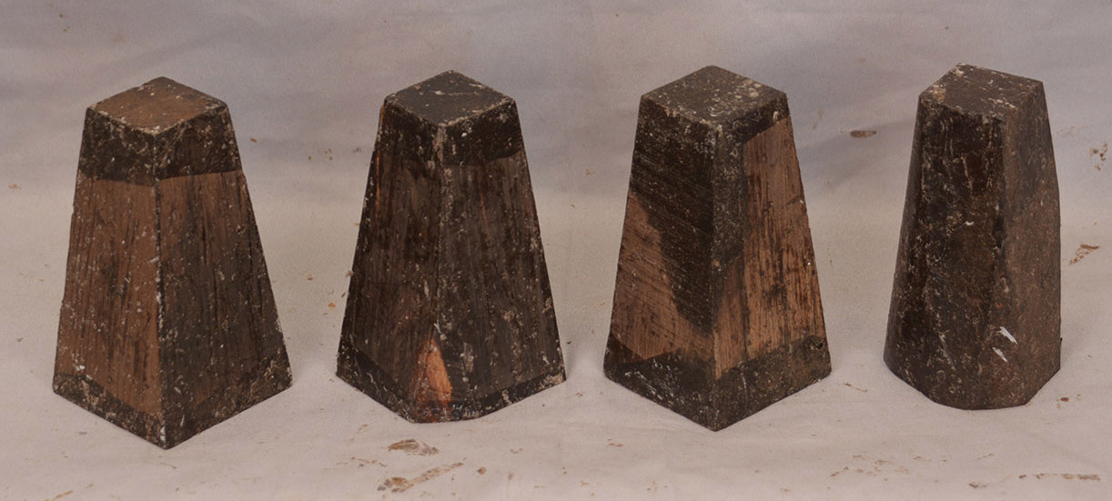 On one end they are 1 1/2-1 5/8" square and the other end is 2 3/8-2 5/8" square with tapered sides as in the photo. Length is 5-5 1/4".