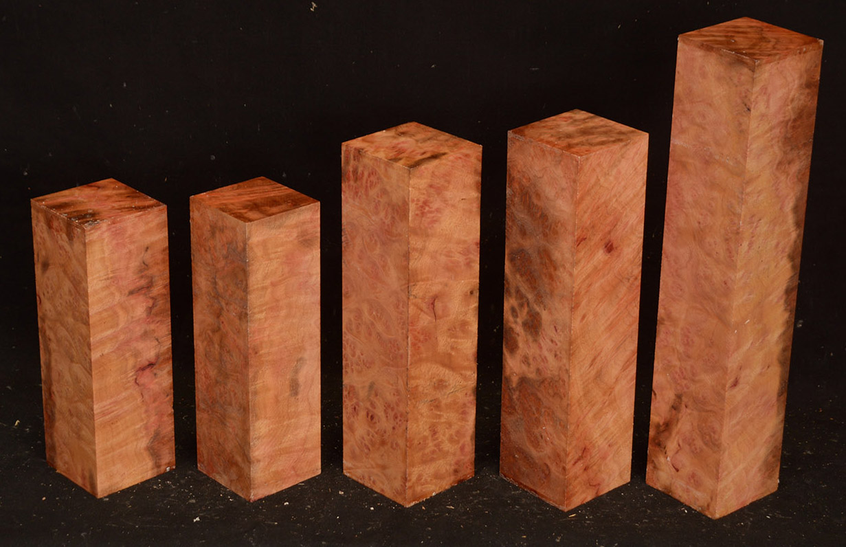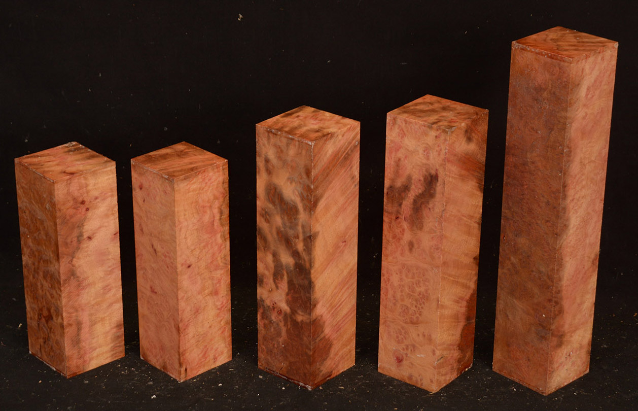 This rare burl is from S.E. Asia and is seldom seen on the world market. It is fine-grained and varies in color from a light reddish-brown to almost scarlet. It is easy to work and has a very pungent, spicy scent. For a burl it is remarkably stable. Green to partially air dried.