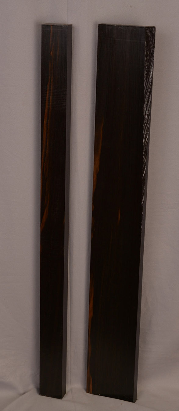 Sometimes called Gabon or Gaboon, this Ebony is sometimes jet black but oftentimes has grayish streaks that mostly disappear when finished or after the made object has been put into service. This Ebony has a marked resistance to checking that is characteristic of some of the Indian and Asian species. It has a wonderful texture and is easily carved, planed, turned, and milled. It is fairly fine-grained and takes a high polish. This Ebony usually originates in either Cameroon or Nigeria and the logs are rough hewn in the forest and oftentimes brought to the nearest road by human porters. With the disappearance of other species of black Ebony this species is fast becoming the Ebony of choice.