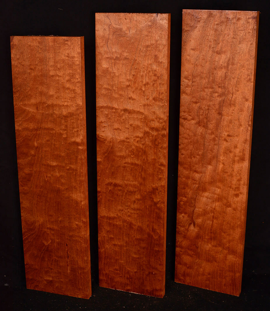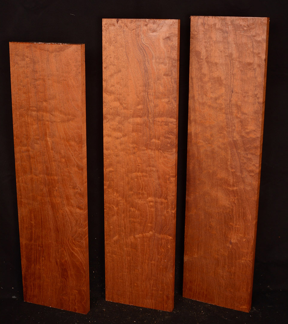 Also called Acajou, Tropical American Mahogany, and Honduras Mahogany. This medium to large tree occurs throughout Central and South America. Related to Cuban Mahogany (Swietenia mahogani) and Pacific Coast Mahogany (Swietenia humilis). It produces one of the classic furniture and cabinetmaking woods. The heartwood varies from a light reddish-brown to a rich, dark red. Generally straight grained and exceptionally stable, it is easy to machine, hand plane, sand and finish. Occasional logs produce several figures, curly, quilted, and the rare plum pudding figure which looks like large drips running down the board. Used in fine furniture and joinery, boat building, and in the guitar industry for acoustic sets and necks.