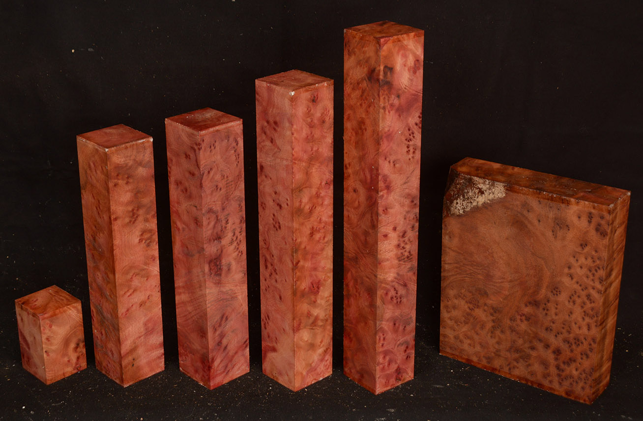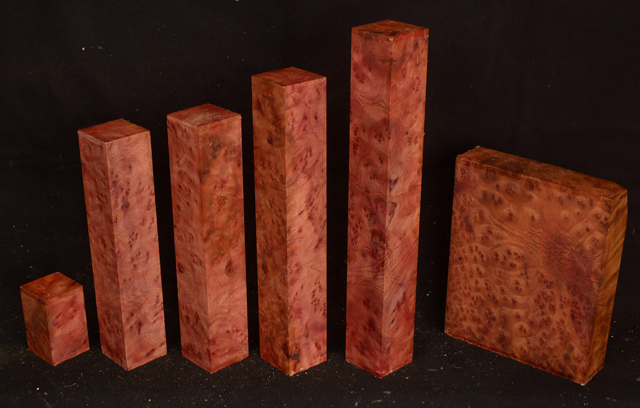 This rare burl is from S.E. Asia and is seldom seen on the world market. It is fine-grained and varies in color from a light reddish-brown to almost scarlet. It is easy to work and has a very pungent, spicy scent. For a burl it is remarkably stable. Green to partially air dried.