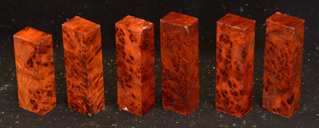 One of the world's most rare and beautiful burls. A light to deep reddish-orange, sometimes with darker lines, and with a lovely, spicy scent, there is hardly an area not highly figured with bird's-eyes. Hard & heavy and capable of taking a fine polish.