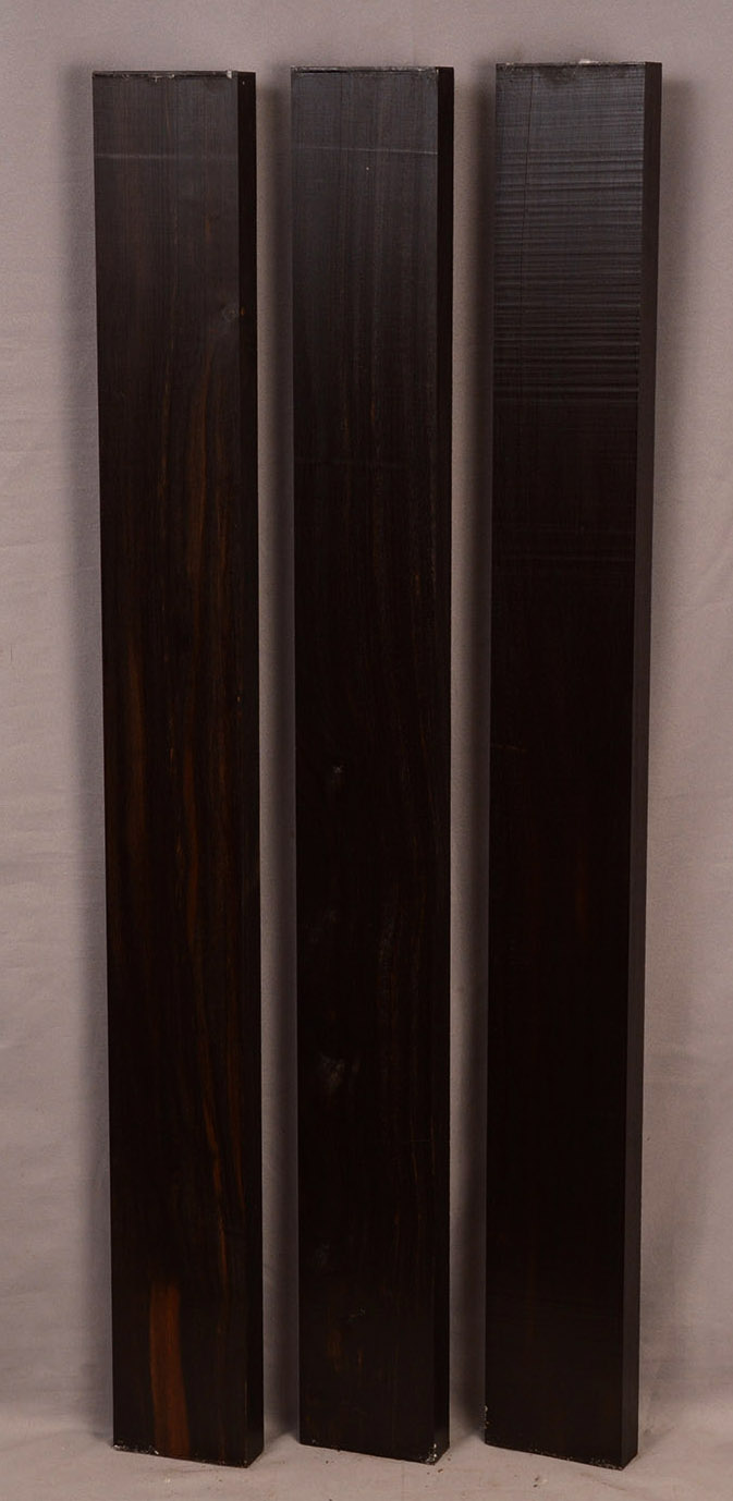 Sometimes called Gabon or Gaboon, this Ebony is sometimes jet black but oftentimes has grayish streaks that mostly disappear when finished or after the made object has been put into service. This Ebony has a marked resistance to checking that is characteristic of some of the Indian and Asian species. It has a wonderful texture and is easily carved, planed, turned, and milled. It is fairly fine-grained and takes a high polish. This Ebony usually originates in either Cameroon or Nigeria and the logs are rough hewn in the forest and oftentimes brought to the nearest road by human porters. With the disappearance of other species of black Ebony this species is fast becoming the Ebony of choice.