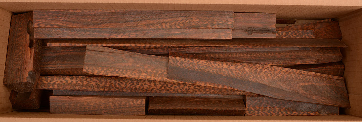 Also called Letterwood and Leopardwood. Color: dark red to reddish brown with irregular black speckles or stripes. Fine textured and highly lustrous. Very hard and heavy, 75-84 lbs/cu ft. Takes a beautiful finish. Very rare and very expensive. Guyana and Surinam.