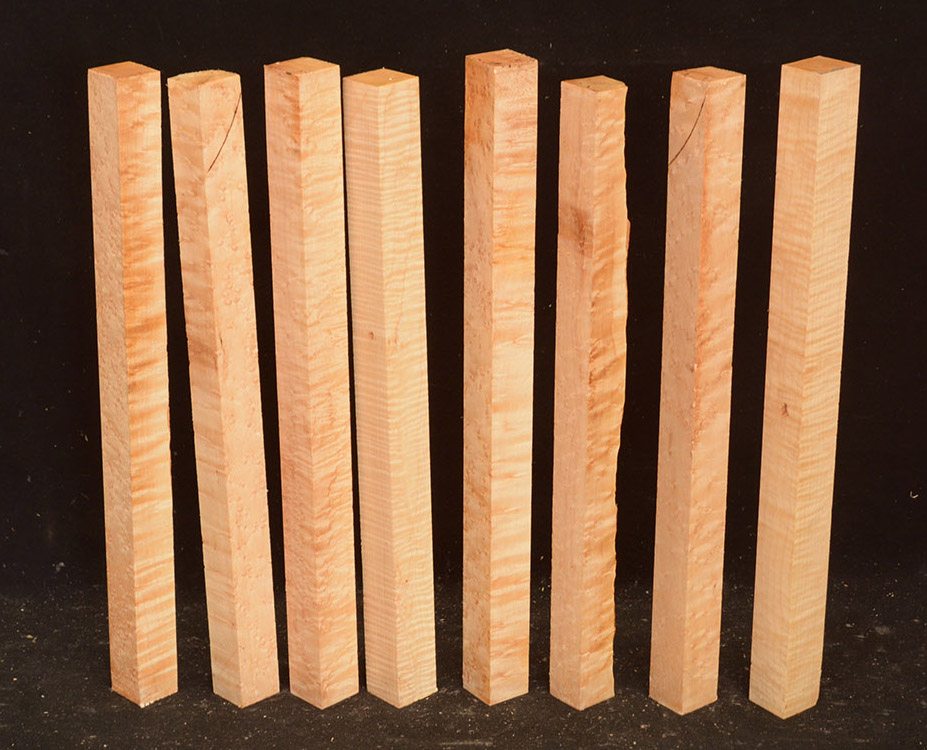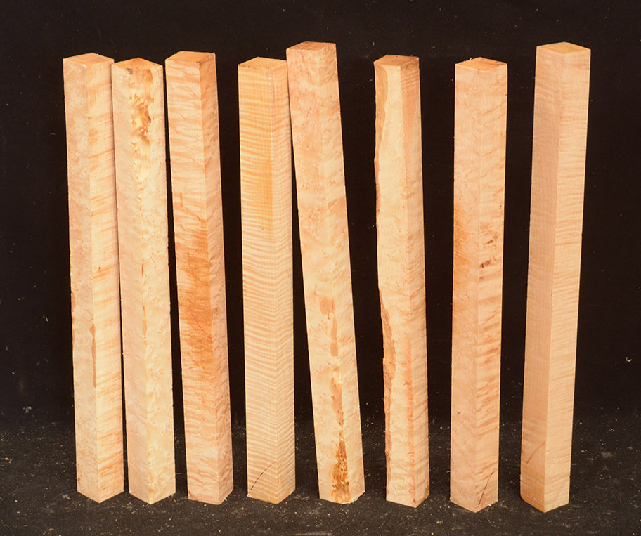 The heartwood is white or cream to light brown or reddish brown. Because of the generally small size of available logs, most sawmills produce flatsawn boards which will show a broken curl on the surface and a fiddleback curl on the quartersawn edge. Hard and heavy, 45 lbs/cu ft. Easy to work and takes a smooth polish. U.S.A.