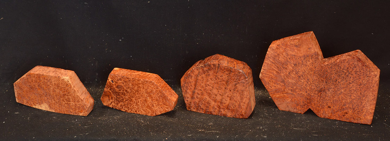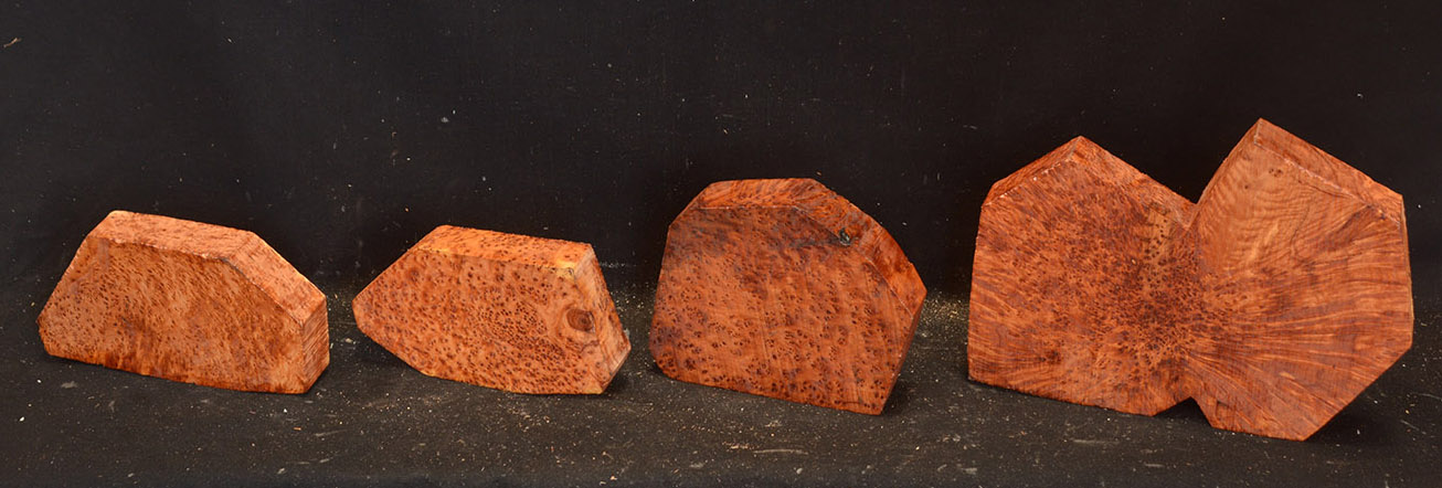 This comes from the Atlas mountains in Morocco and has a beautiful golden chatoyance. Its color varies from a rich, lustrous golden brown to nearly black. Thuya burl is hard and dense with a high oil content, but tends to be brittle. The eyes, perfectly round, are scattered about in some burls like the figure in bird's-eye maple; in others they are grouped as islands. Due to it's desert occurrence, the wood sometimes contains small defects or inclusions but most can be repaired with cyanoacrylate (super) glues. A rare species, this exquisite wood is used for inlays, small boxes, turnery, and precious objects.