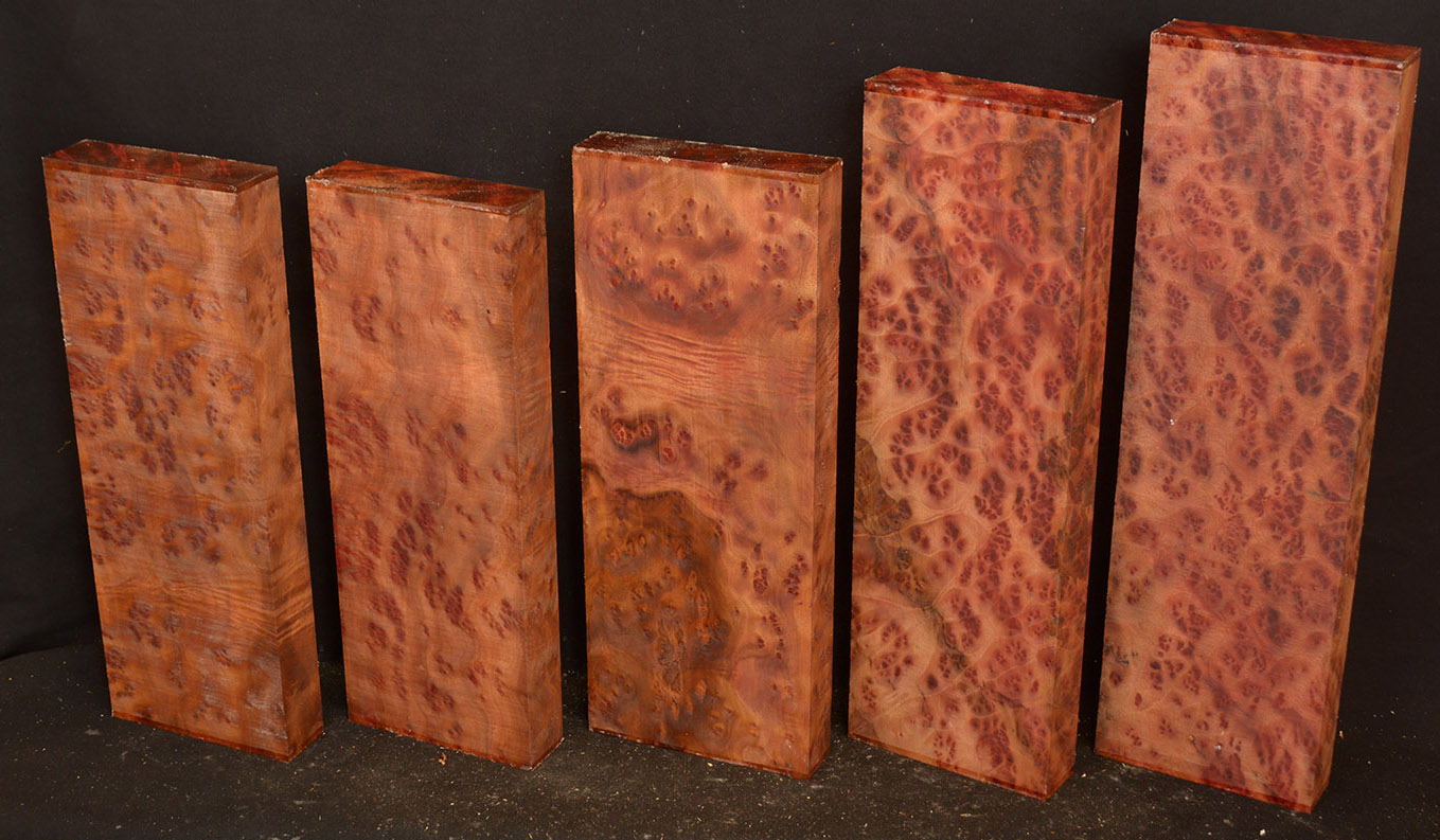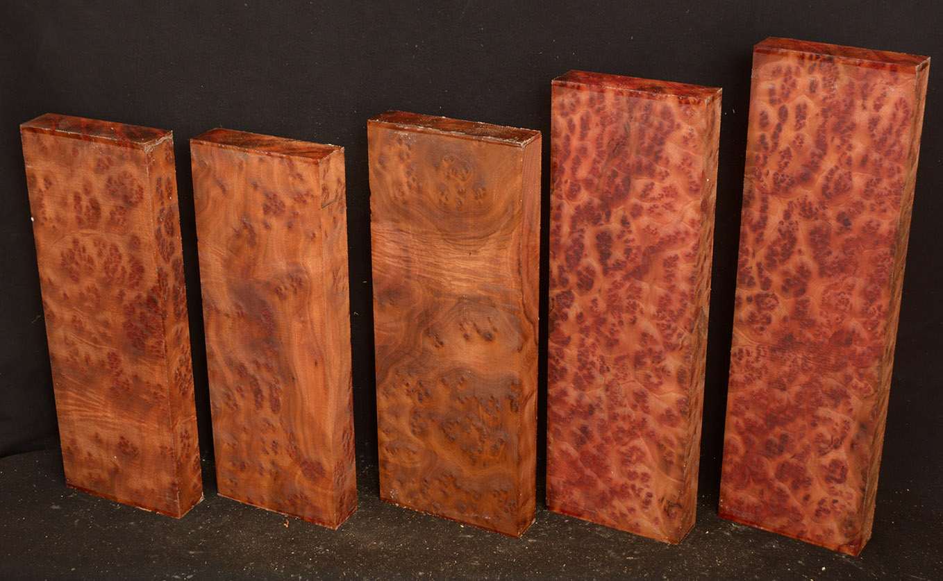 This rare burl is from S.E. Asia and is seldom seen on the world market. It is fine-grained and varies in color from a light reddish-brown to almost scarlet. It is easy to work and has a very pungent, spicy scent. For a burl it is remarkably stable. Green to partially air dried.