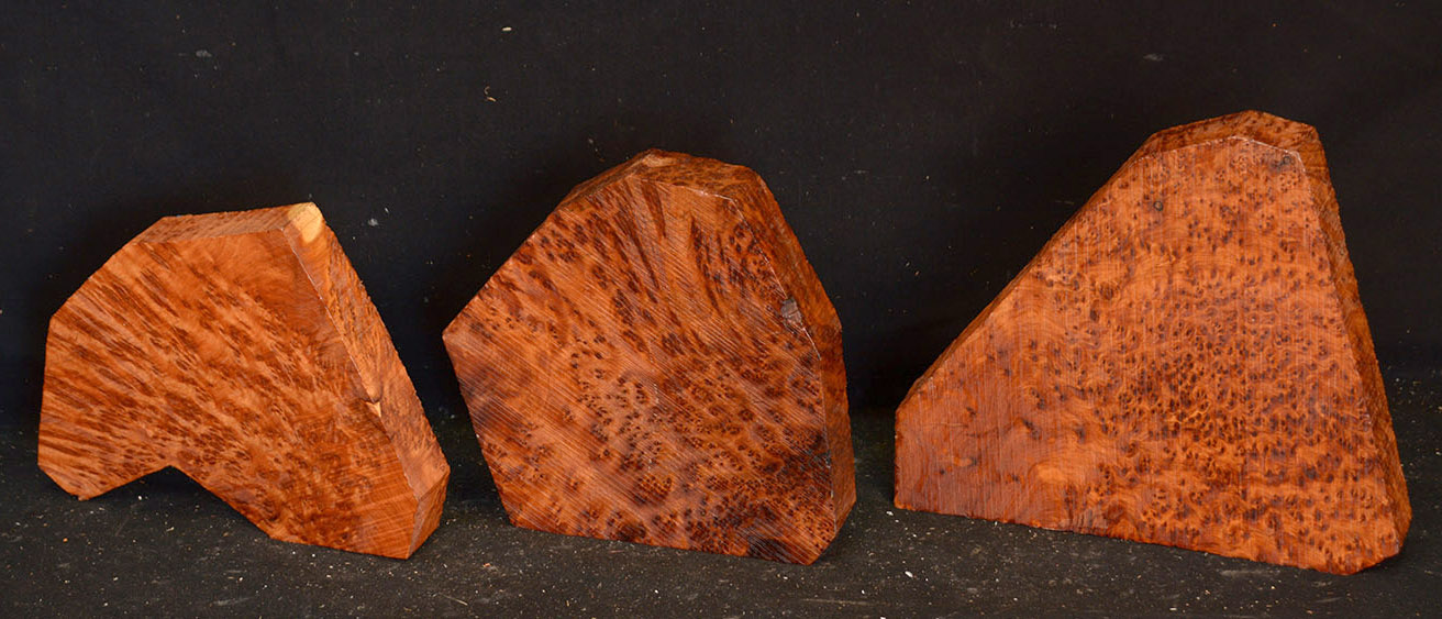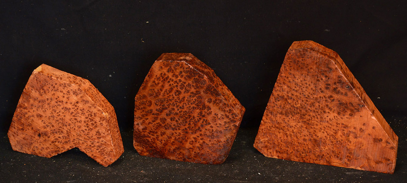 This comes from the Atlas mountains in Morocco and has a beautiful golden chatoyance. Its color varies from a rich, lustrous golden brown to nearly black. Thuya burl is hard and dense with a high oil content, but tends to be brittle. The eyes, perfectly round, are scattered about in some burls like the figure in bird's-eye maple; in others they are grouped as islands. Due to it's desert occurrence, the wood sometimes contains small defects or inclusions but most can be repaired with cyanoacrylate (super) glues. A rare species, this exquisite wood is used for inlays, small boxes, turnery, and precious objects.