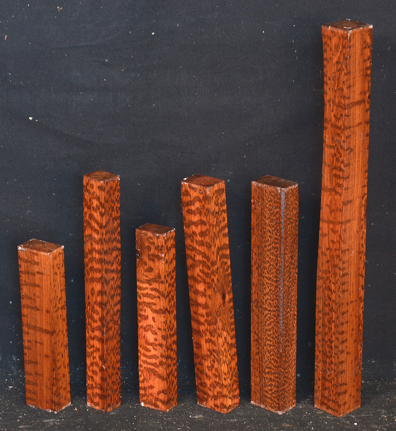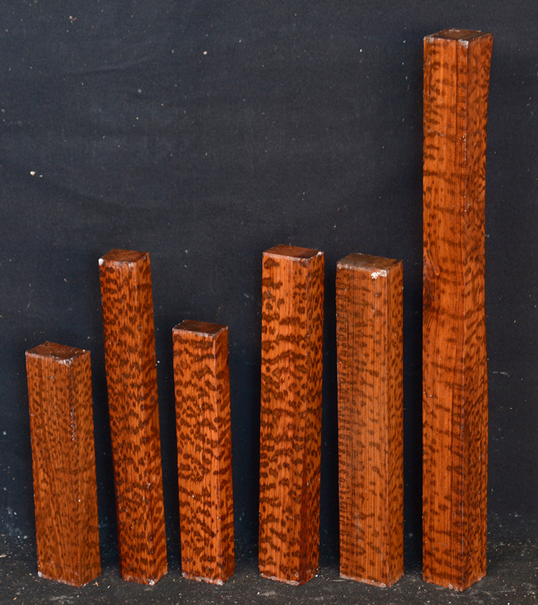 Also called Letterwood and Leopardwood. Color: dark red to reddish brown with irregular black speckles or stripes. Fine textured and highly lustrous. Very hard and heavy, 75-84 lbs/cu ft. Takes a beautiful finish. Very rare and very expensive. Guyana and Surinam.