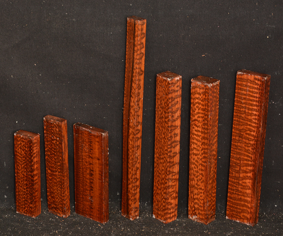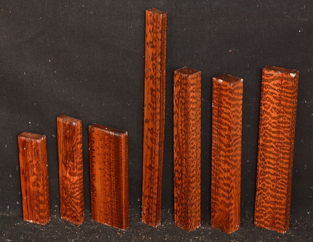 Also called Letterwood and Leopardwood. Color: dark red to reddish brown with irregular black speckles or stripes. Fine textured and highly lustrous. Very hard and heavy, 75-84 lbs/cu ft. Takes a beautiful finish. Very rare and very expensive. Guyana and Surinam.