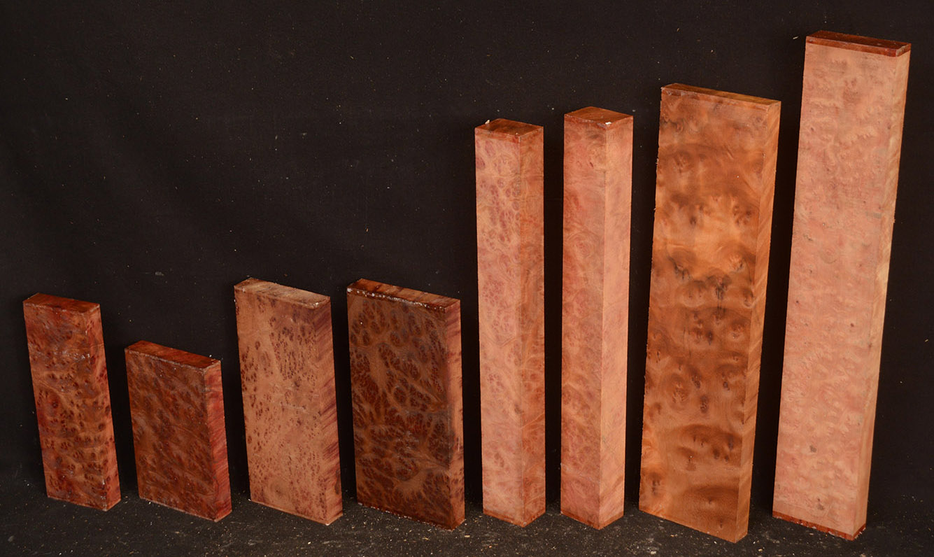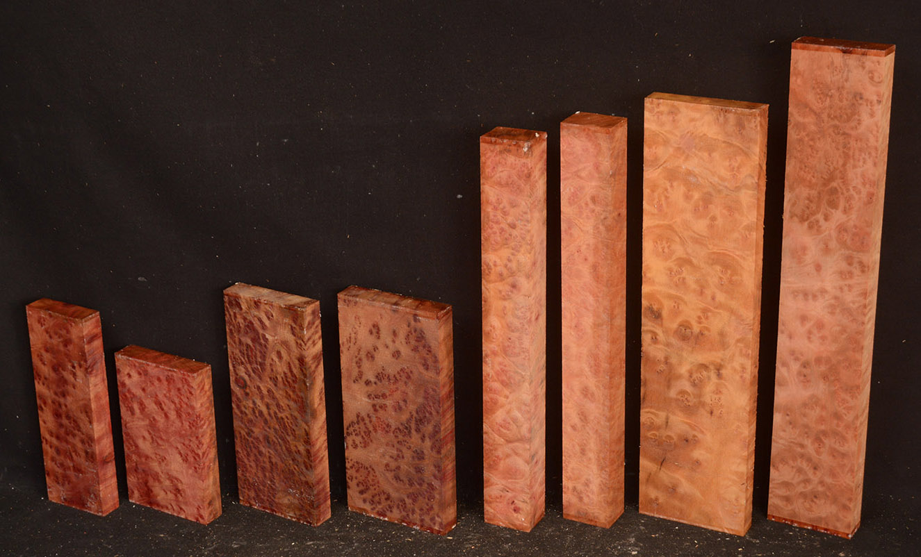This rare burl is from S.E. Asia and is seldom seen on the world market. It is fine-grained and varies in color from a light reddish-brown to almost scarlet. It is easy to work and has a very pungent, spicy scent. For a burl it is remarkably stable. Green to partially air dried.