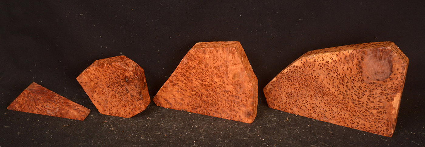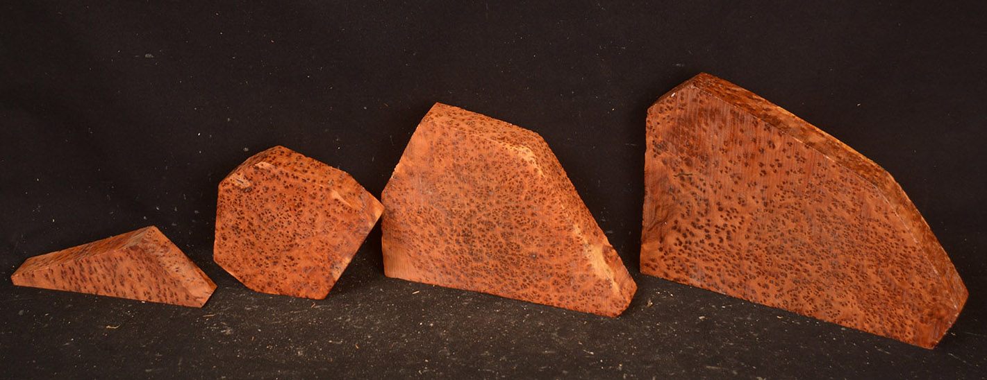 This comes from the Atlas mountains in Morocco and has a beautiful golden chatoyance. Its color varies from a rich, lustrous golden brown to nearly black. Thuya burl is hard and dense with a high oil content, but tends to be brittle. The eyes, perfectly round, are scattered about in some burls like the figure in bird's-eye maple; in others they are grouped as islands. Due to it's desert occurrence, the wood sometimes contains small defects or inclusions but most can be repaired with cyanoacrylate (super) glues. A rare species, this exquisite wood is used for inlays, small boxes, turnery, and precious objects.