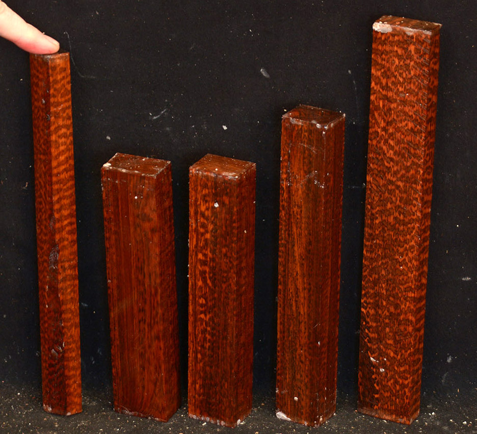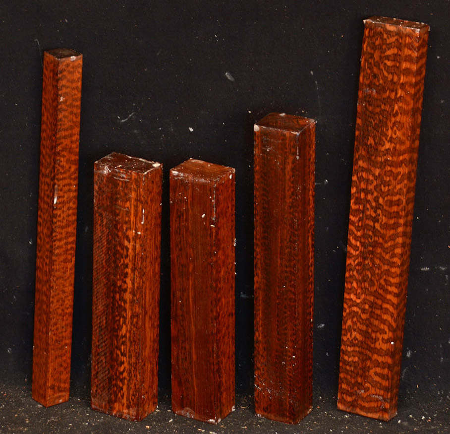 Also called Letterwood and Leopardwood. Color: dark red to reddish brown with irregular black speckles or stripes. Fine textured and highly lustrous. Very hard and heavy, 75-84 lbs/cu ft. Takes a beautiful finish. Very rare and very expensive. Guyana and Surinam.