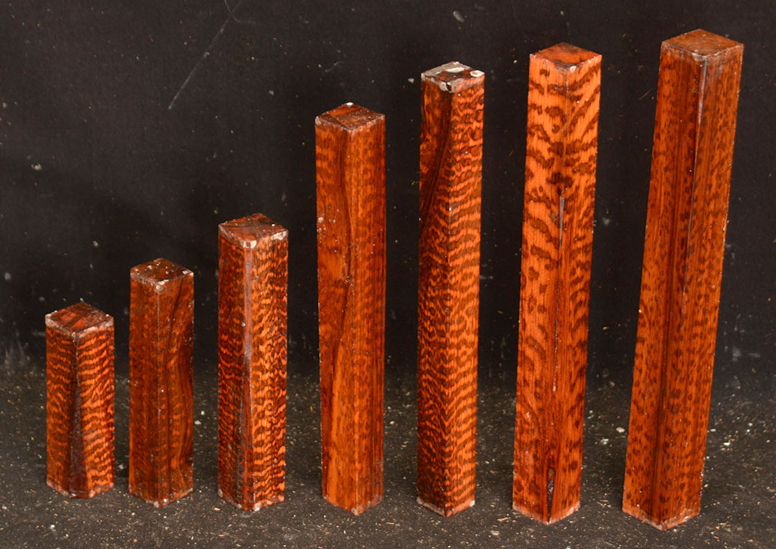 Also called Letterwood and Leopardwood. Color: dark red to reddish brown with irregular black speckles or stripes. Fine textured and highly lustrous. Very hard and heavy, 75-84 lbs/cu ft. Takes a beautiful finish. Very rare and very expensive. Guyana and Surinam.
