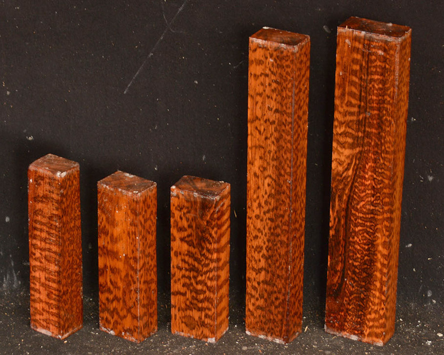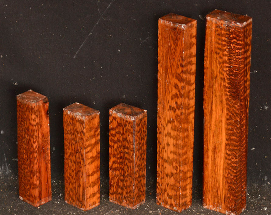 Also called Letterwood and Leopardwood. Color: dark red to reddish brown with irregular black speckles or stripes. Fine textured and highly lustrous. Very hard and heavy, 75-84 lbs/cu ft. Takes a beautiful finish. Very rare and very expensive. Guyana and Surinam.