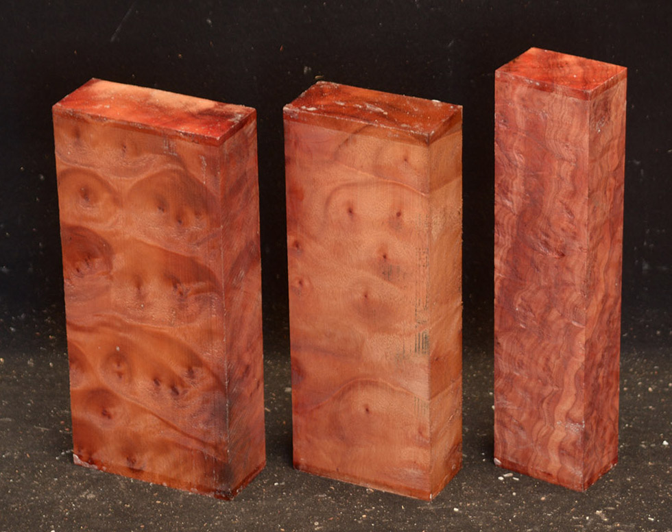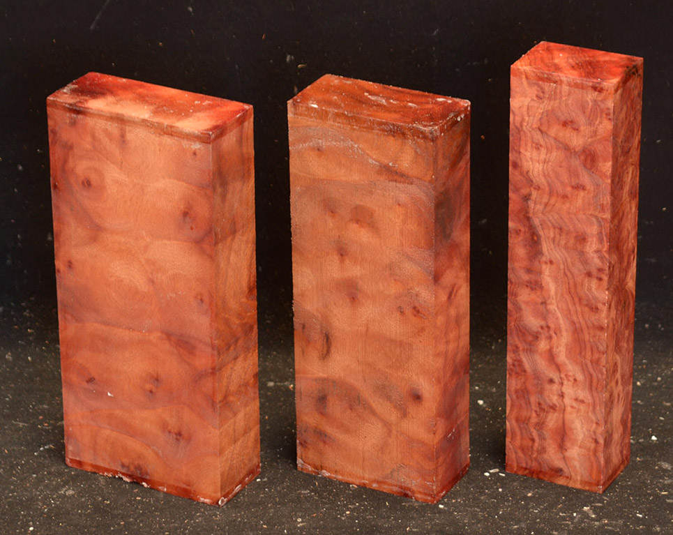This rare burl is from S.E. Asia and is seldom seen on the world market. It is fine-grained and varies in color from a light reddish-brown to almost scarlet. It is easy to work and has a very pungent, spicy scent. For a burl it is remarkably stable. Green to partially air dried.